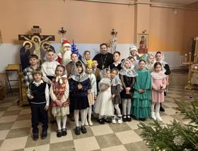 Педагоги, воспитанники и родители младшего отделения воскресной школы «Зернышки» кафедрального собора Покрова Пресвятой Богородицы г. Гродно собрались за праздничным чаепитием, во время которого совместно исполнили рождественские колядки.