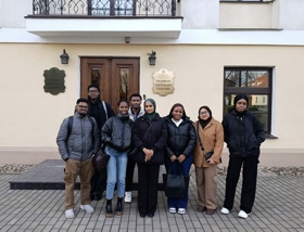 13 ноября в рамках соглашения о сотрудничестве между Гродненским государственным медицинским университетом и Гродненской епархией для иностранных учащихся вуза из Нигерии, Зимбабве, Шри-Ланки и Мальдивских островов была организована экскурсия. Референт-переводчик Управляющего Гродненской епархии Рада Спото познакомила гостей с архитектурным комплексом архиерейского подворья и церковно-историческим кабинетом.