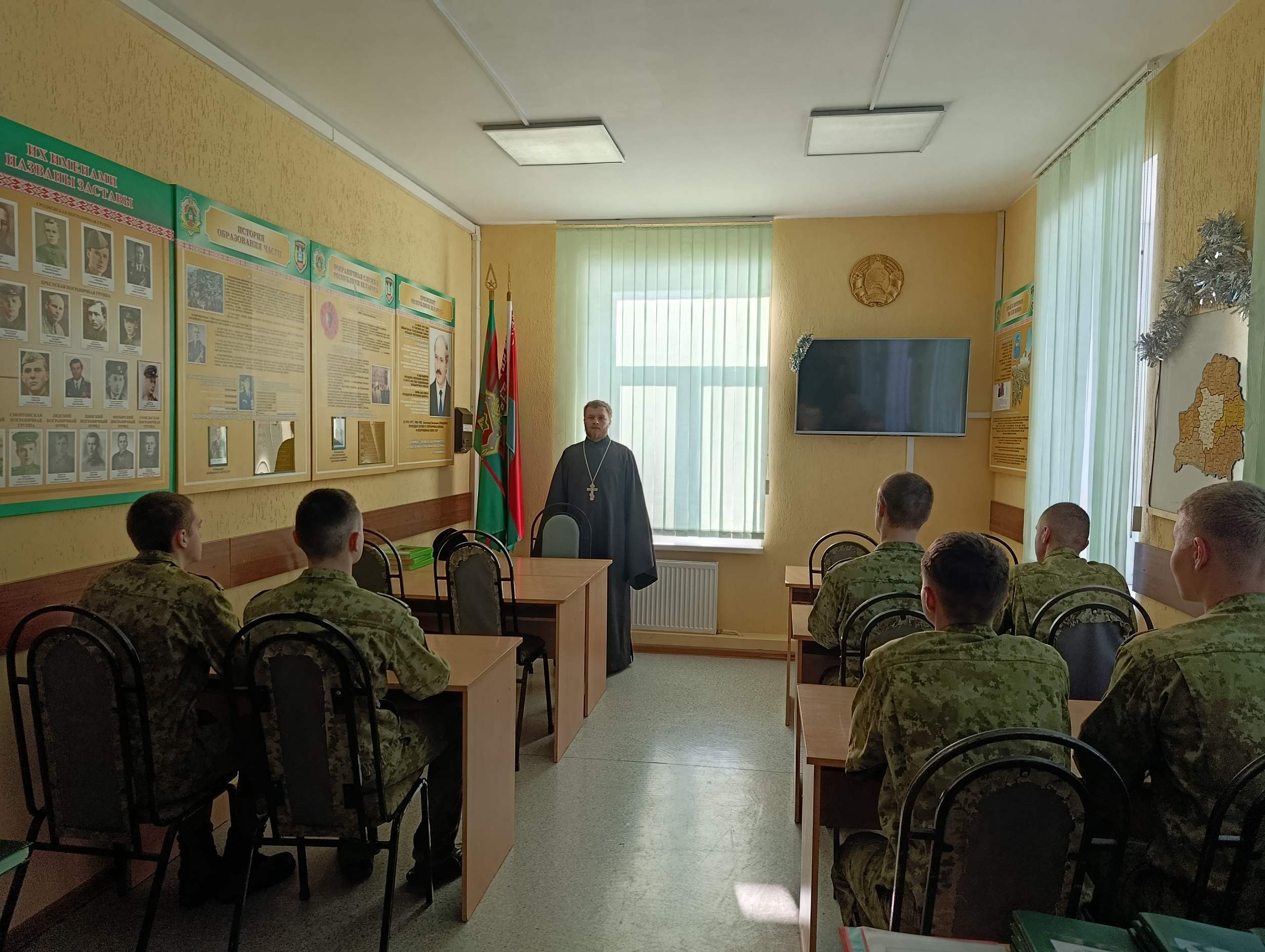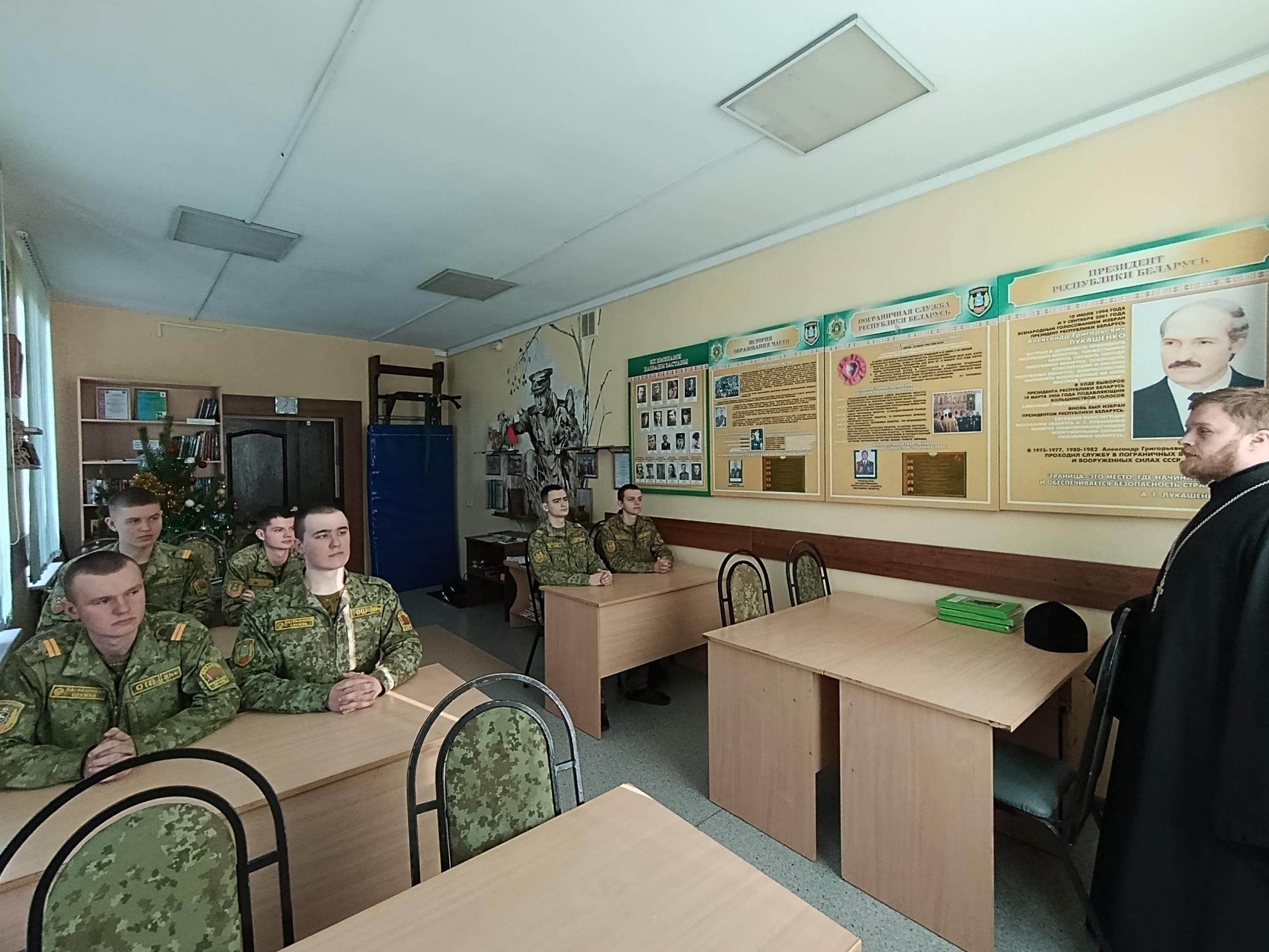 4 января клирик кафедрального собора Покрова Пресвятой Богородицы г. Гродно иерей Василий Астапович посетил пограничную заставу № 9, где провел беседу с военнослужащими, посвященную предстоящему празднику Рождества Христова.