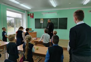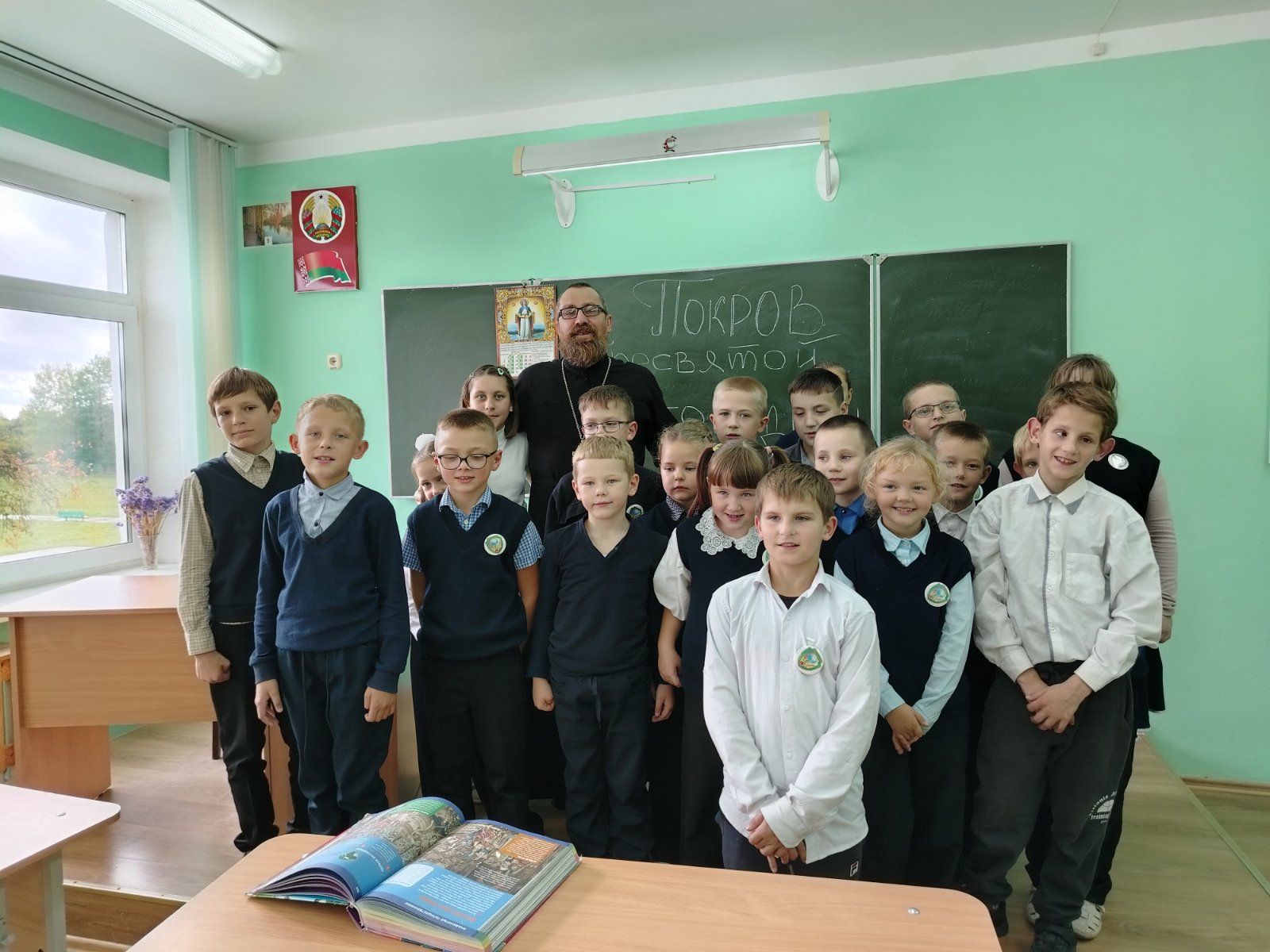 10 октября настоятель прихода храма Рождества Пресвятой Богородицы деревни Мурованка Щучинского района иерей Олег Засим посетил государственное учреждение образования «Скрибовская средняя школа» и провел беседу с учащимися 1–7-х классов на тему «Покров Пресвятой Богородицы».
