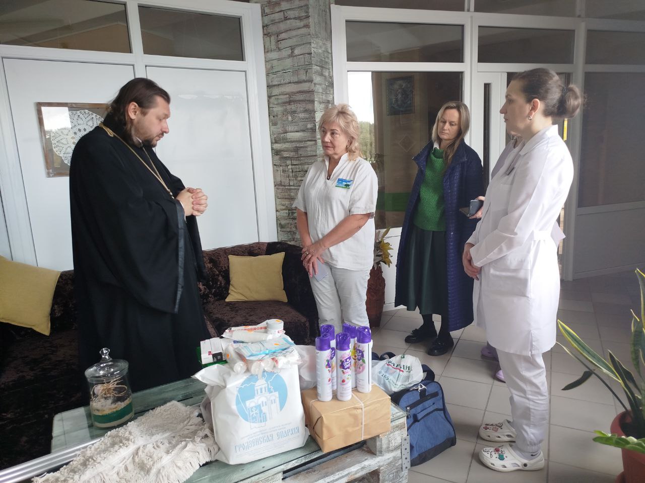После богослужения состоялась встреча с заведующей отделением Людмилой Константиновной Черняковой и медицинским персоналом. Отдел социального служения и благотворительности Гродненской епархии передал для нужд хосписа перевязочные материалы, лечебные мази, средства гигиены, хозяйственный инвентарь и канцелярские принадлежности.