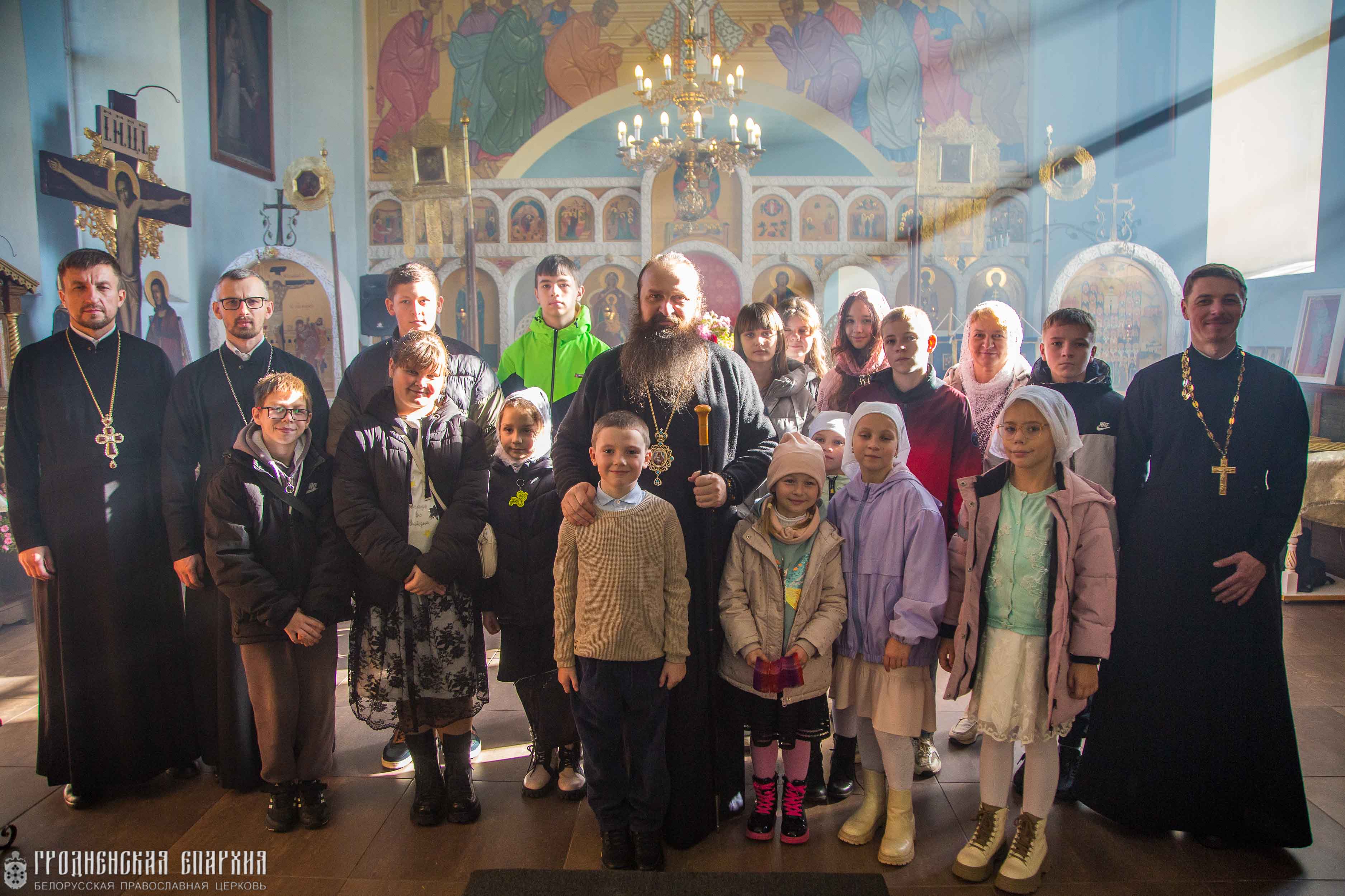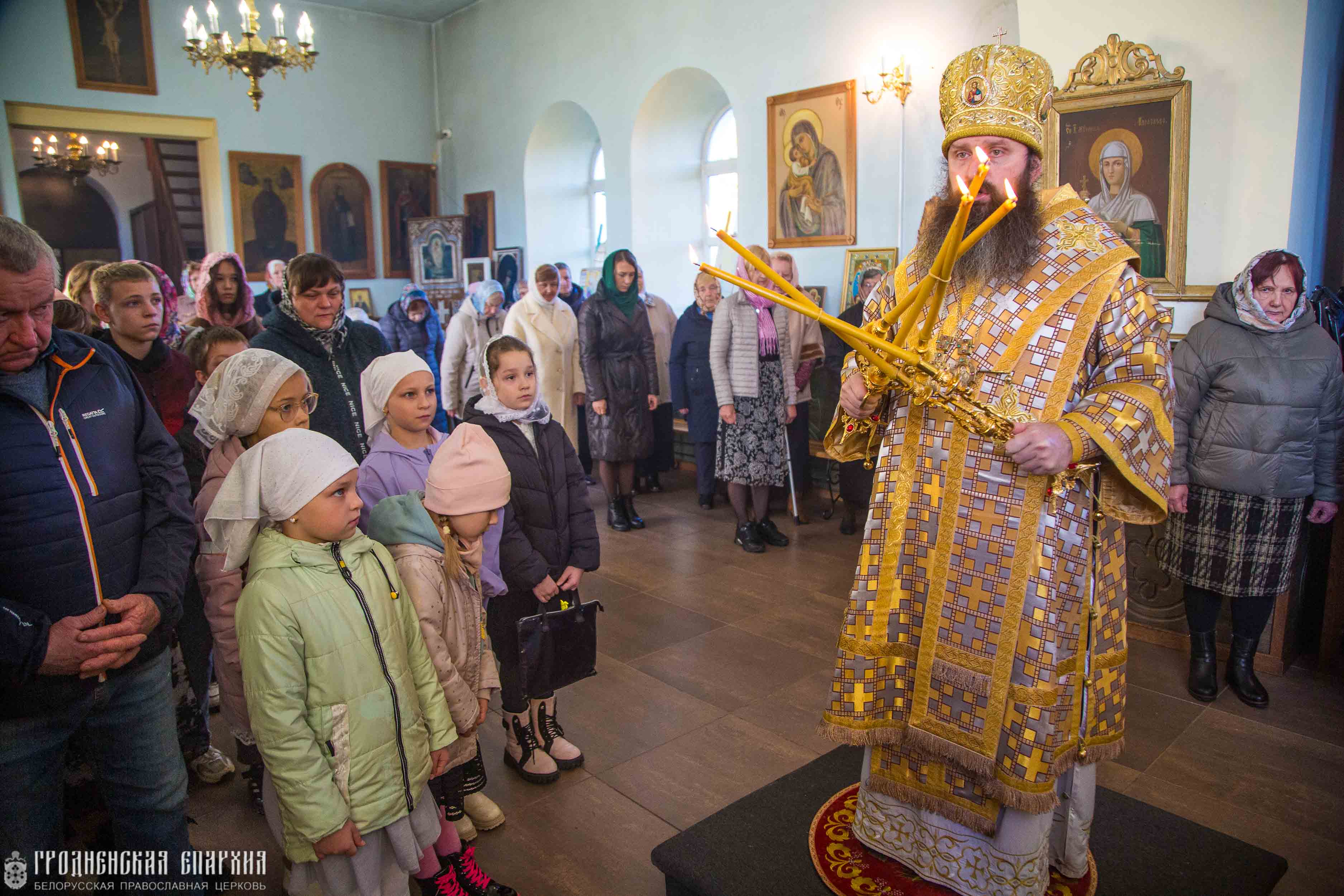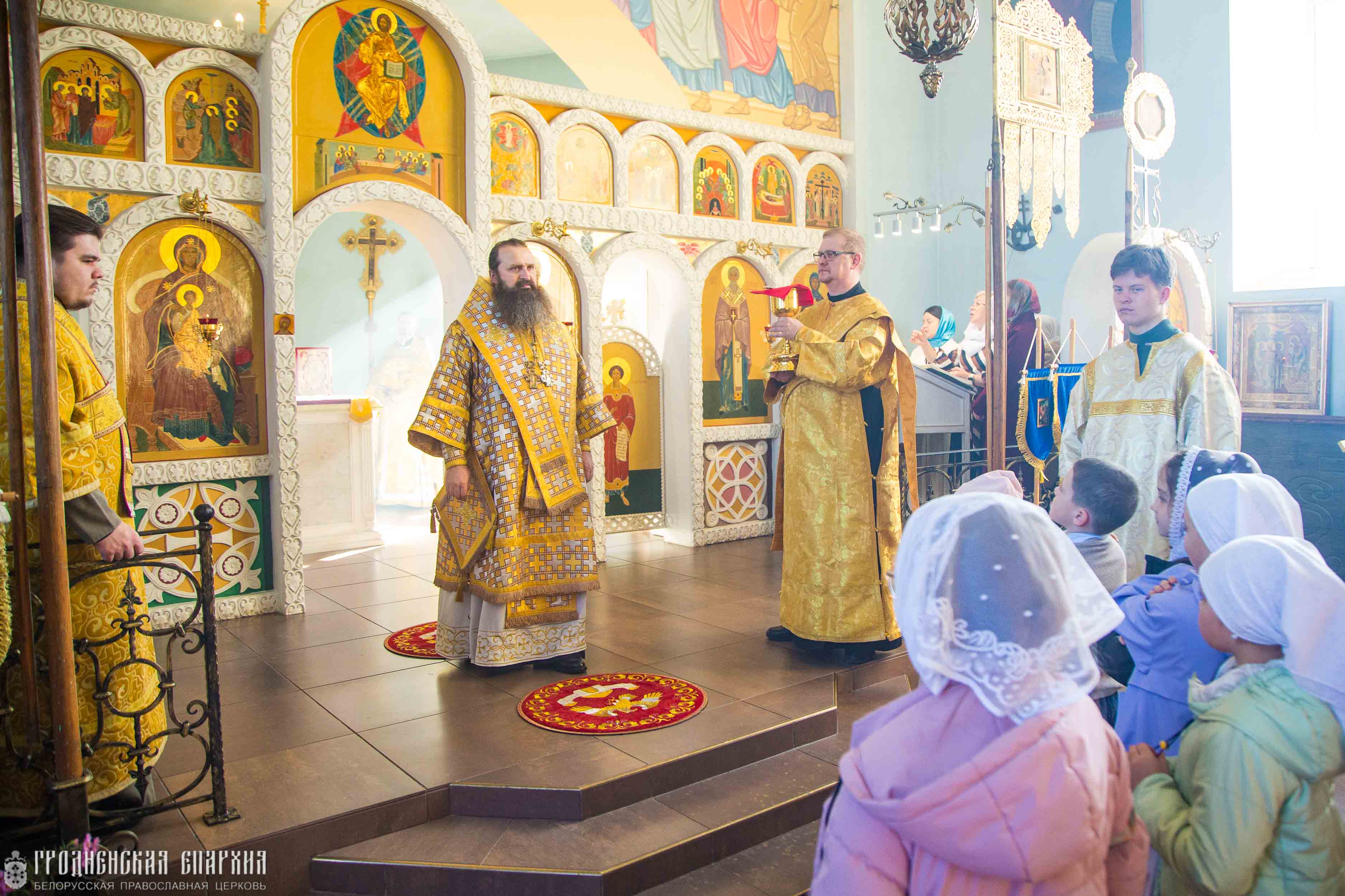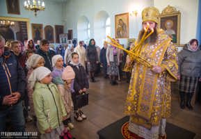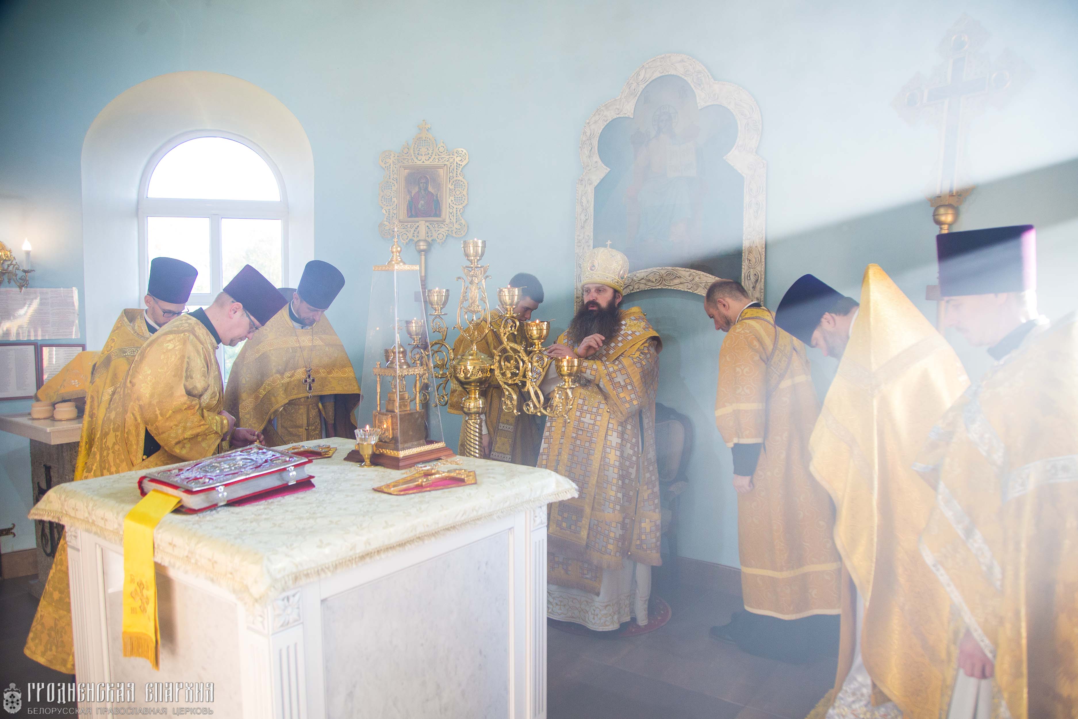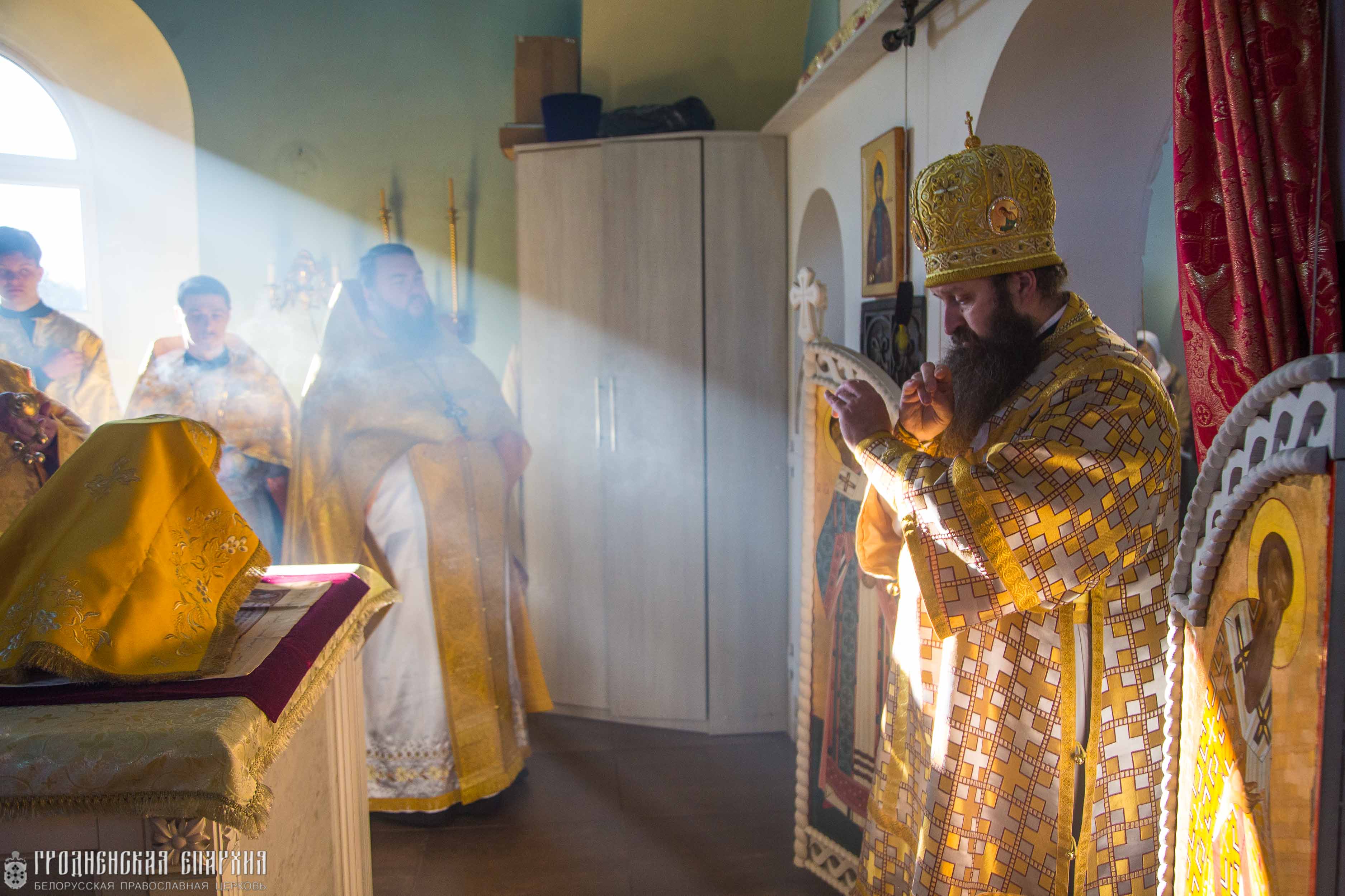 Его Высокопреосвященству сослужили: протоиерей Николай Лабынько, Секретарь Гродненской епархии; протоиерей Кирилл Близнюк, благочинный Скидельского церковного округа; иерей Владимир Гришкевич, настоятель прихода храма Успения Пресвятой Богородицы; иерей Павел Фокин, клирик прихода храма Великомученика Георгия Победоносца города Несвиж Слуцкой епархии.