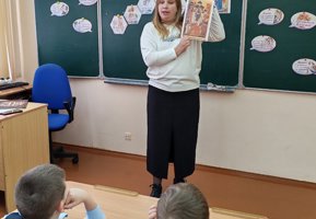 Во время урока матушка показала учащимся икону Покрова Пресвятой Богородицы, на которой Божия Матерь изображена простирающей свой омофор над молящимися. Священное изображение послужило поводом для беседы о значении праздника, раскрывающего любовь и заботу Пресвятой Богородицы о людях.