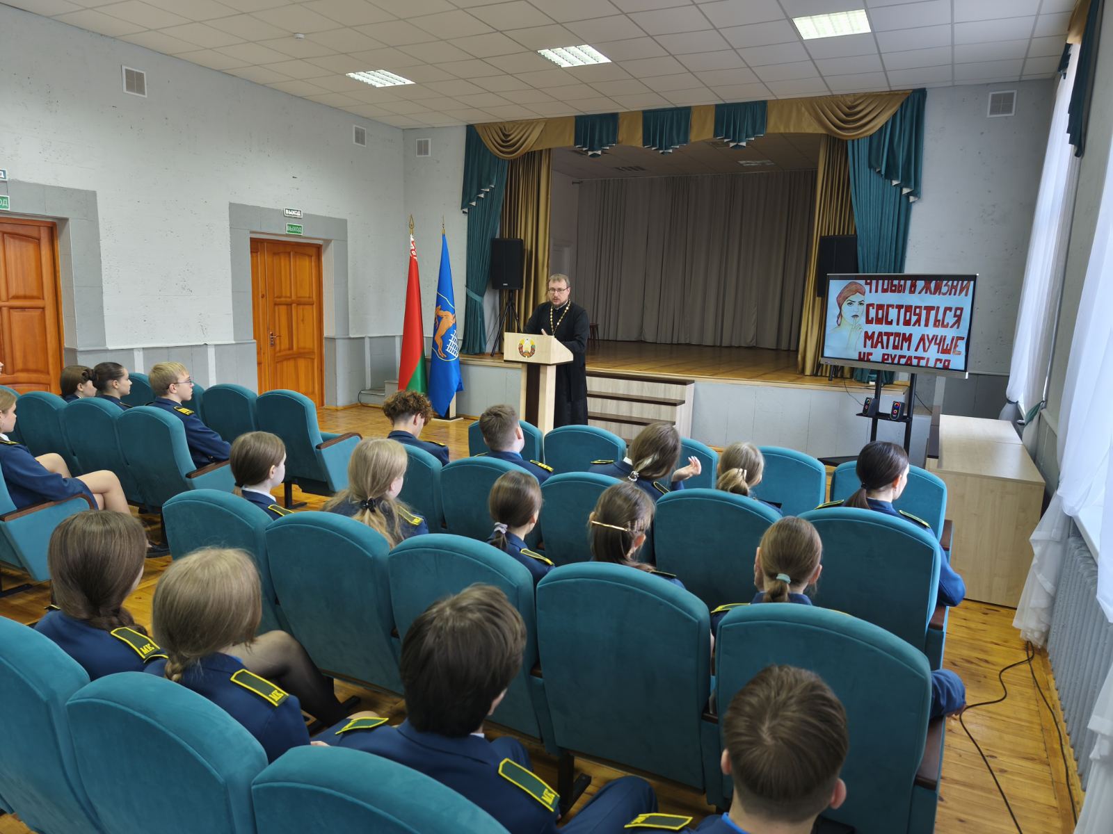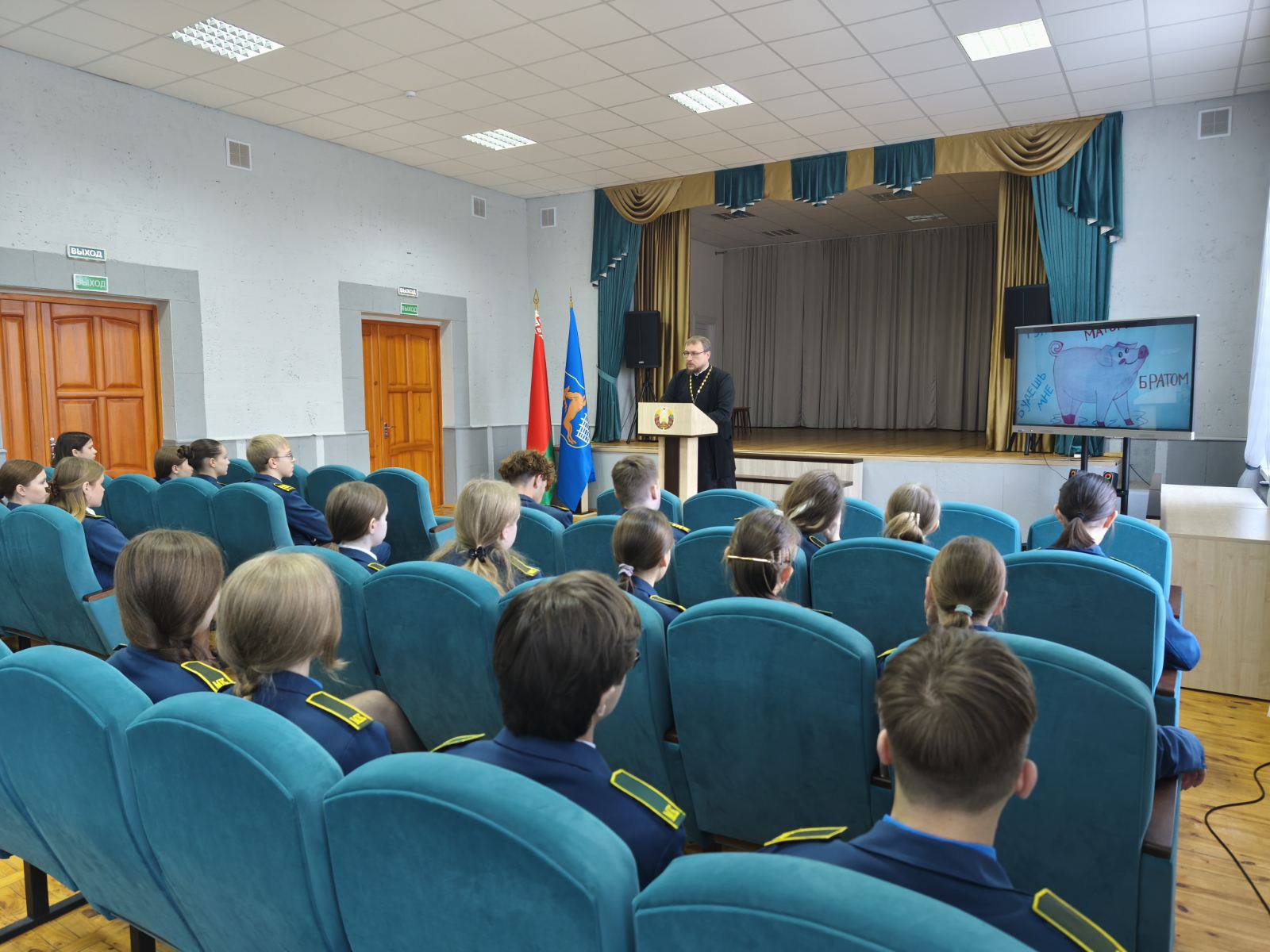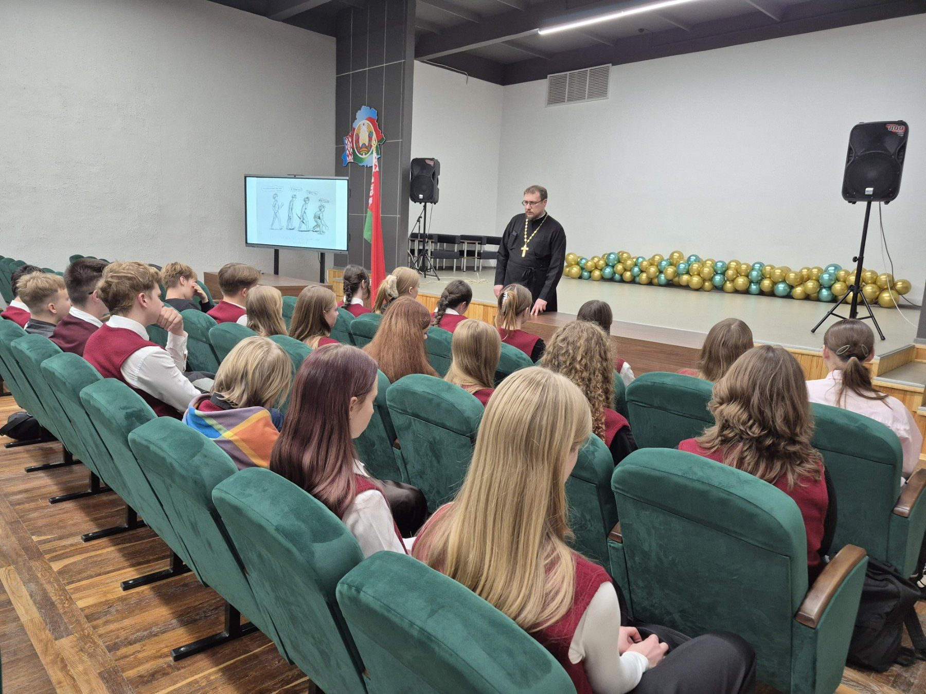 Беседа была приурочена к Республиканской акции «Я и моя семья – без сквернословия». Священнослужитель продемонстрировал творческие работы молодёжного проекта «Мат – не наш формат», рассказал о взаимосвязи чистоты речи и чистоты души, призвал учащихся к молитве, внутренней собранности и чтению доброй литературы, формирующей духовный вкус и культуру общения.