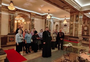 Заключительным пунктом первого дня паломничества стал кафедральный собор Рождества Христова г. Солигорска, где обзорную экскурсию для паломников провел иерей Димитрий Бровушкин.