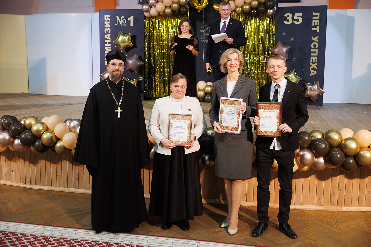 От имени Гродненской епархии отец Евгений вручил благодарственные письма педагогам гимназии Инессе Ивановне Будевич, Александру Александровичу Перегудову и Татьяне Геннадьевне Яковлевой — за труды во славу Святой Церкви и плодотворное сотрудничество с приходом.