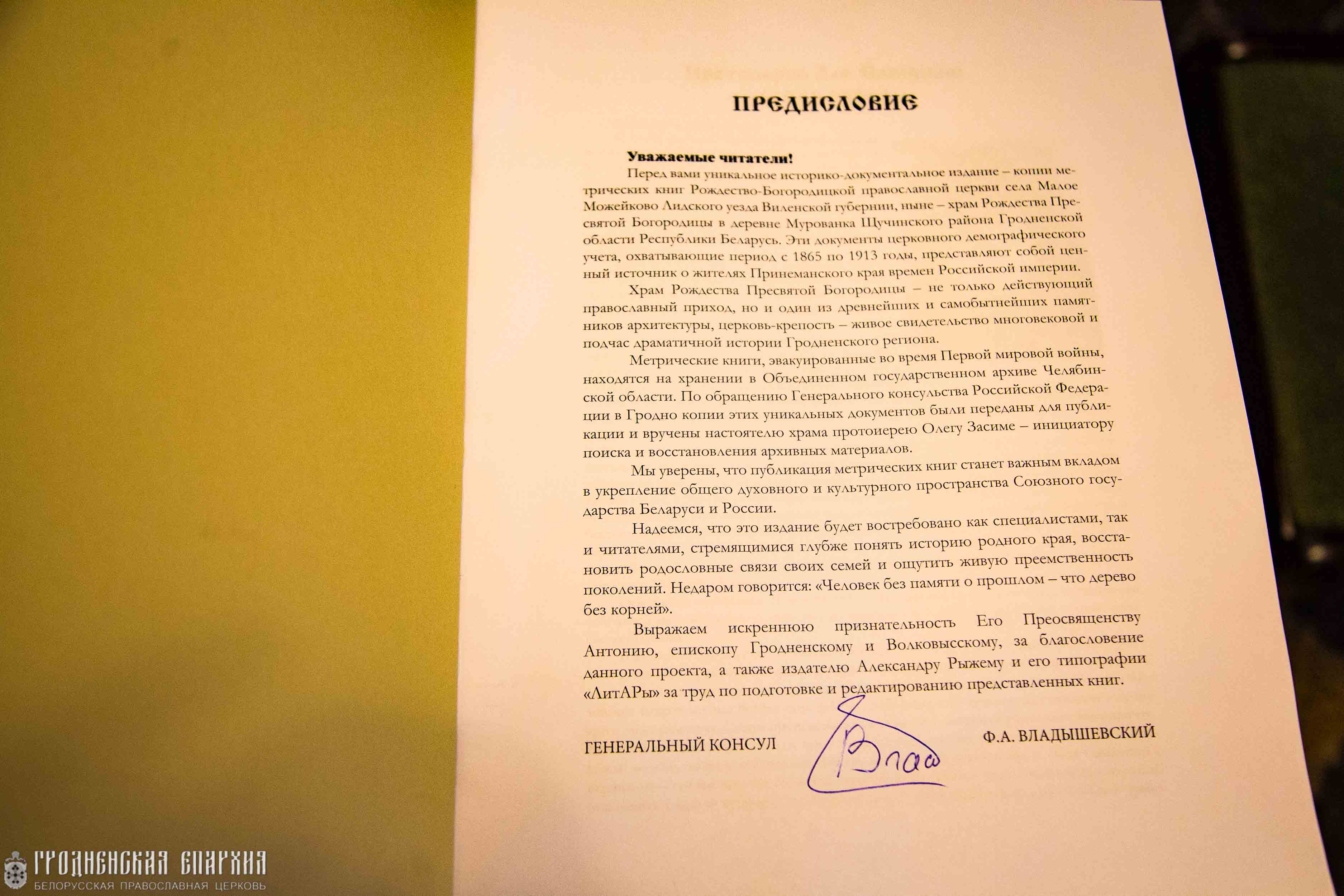 В тожественной обстановке Феодосий Александрович передал иерею Олегу изданные копии метрических книг прихода Рождества Пресвятой Богородицы д. Мурованка Щучинского благочиния за 1865-1913 годы, эвакуированные в 1915 году в г. Челябинск (Российская Федерация), а также их электронный архив.