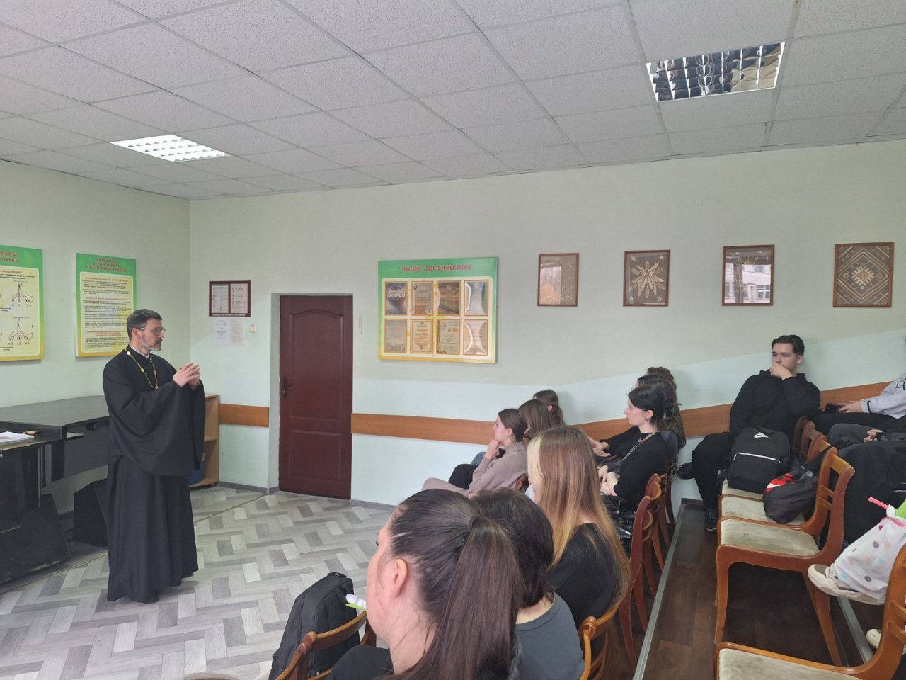 Священнослужитель встретился с учащимися 3 курса. В ходе беседы была затронута тема семьи: её происхождение, конституционное определение, а также значение таинства венчания в жизни христианской семьи.