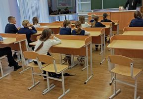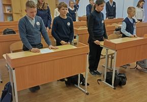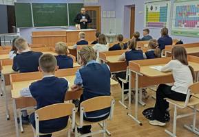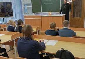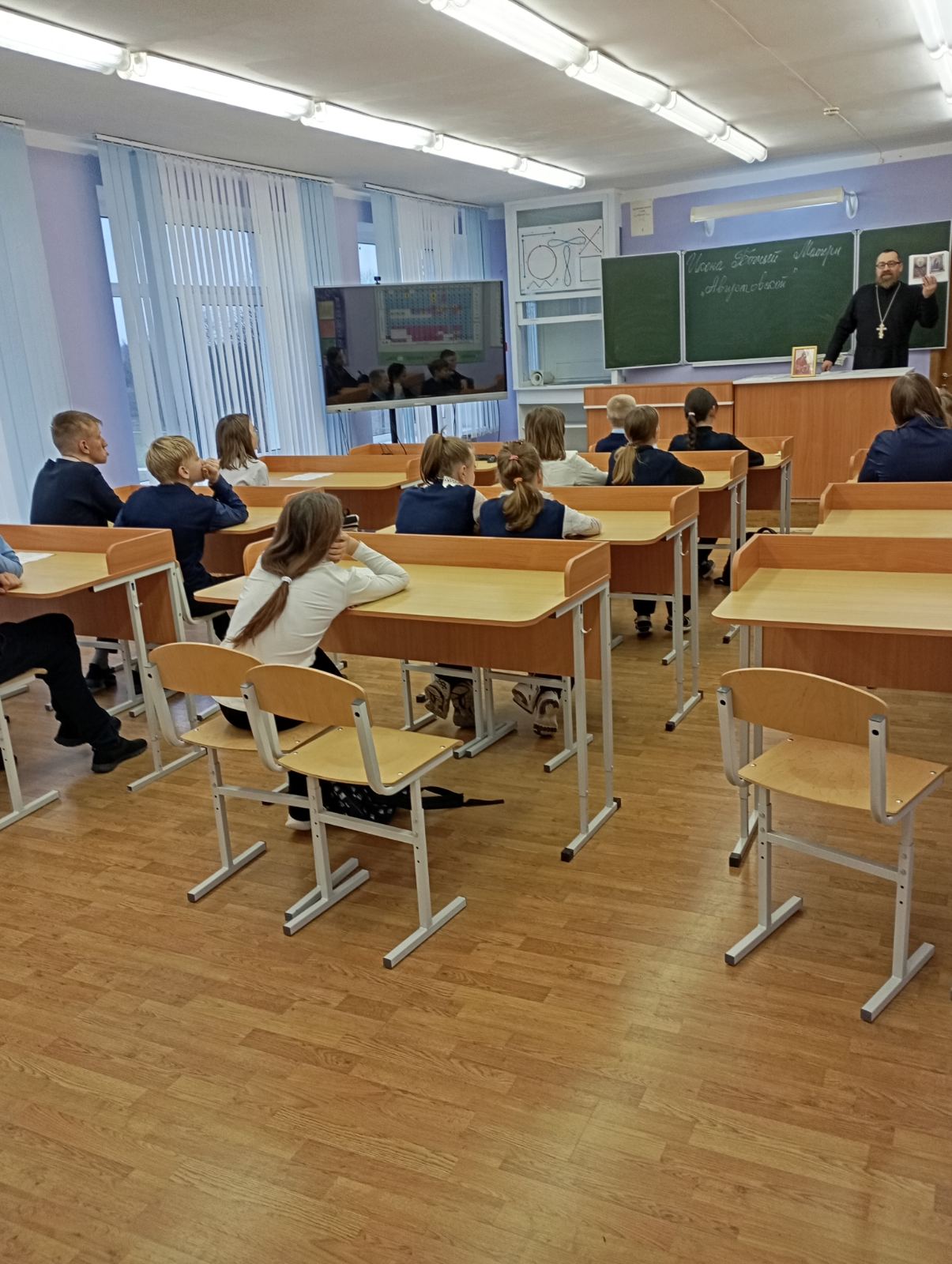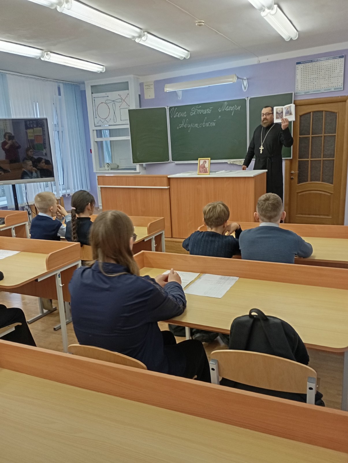 Школьники внимательно слушали рассказ священника о истории явления Божией Матери донским казакам в районе Августовских лесов в сентябре 1914 года во время сражений Первой мировой войны, написании икон по заказам казачек в память об этом чуде, возникновении почитания Августовского образа Божией Матери.