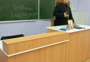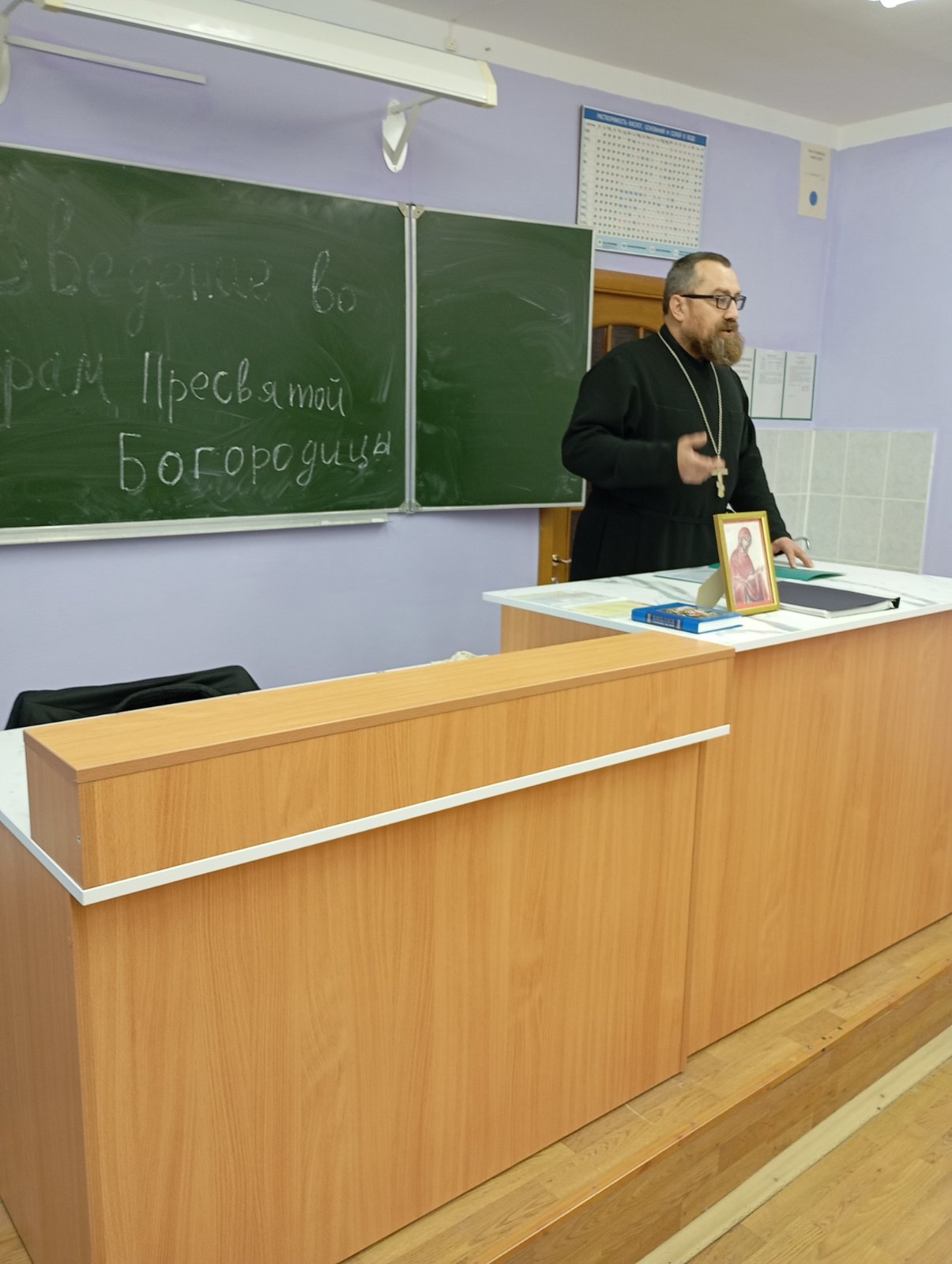 В первой части встречи священник рассказал школьникам о событии Введения во храм Пресвятой Владычицы нашей Богородицы и Приснодевы Марии — дне, в котором Церковь видит начало исполнения Божественного замысла о спасении рода человеческого. Отец Олег объяснил, что по достижении трехлетнего возраста Пречистая Дева была приведена в Иерусалимский храм, что стало предзнаменованием воплощения, земной проповеди, Крестной смерти и славного Воскресения Господа нашего Иисуса Христа.