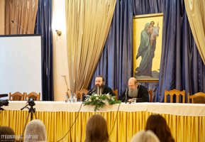 Во встрече также принимал участие архимандрит Мелхиседек (Артюхин), настоятель храма святых апостолов Петра и Павла в Ясеневе (московского подворья Введенского ставропигиального монастыря Оптина пустынь), пресс-секретарь Синодального отдела Русской Православной Церкви по монастырям и монашеству.