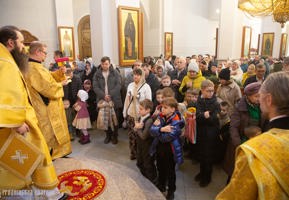 По отпусте Божественной литургии архиепископ Антоний обратился к верующим с архипастырским словом и поздравил прихожан, праздновавших свои дни рождения, вручив им просфоры.