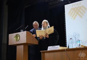 В конце встречи ректор ГГАУ Валентин Валентинович Пешко поблагодарил архимандрита Мелхиседека (Артюхина) за содержательную и глубокую беседу и вручил на память о визите в аграрный университет г. Гродно фотоальбом «Коложская церковь» на белорусском, русском и английском языках (автор текста и составитель — Александр Лосминский).