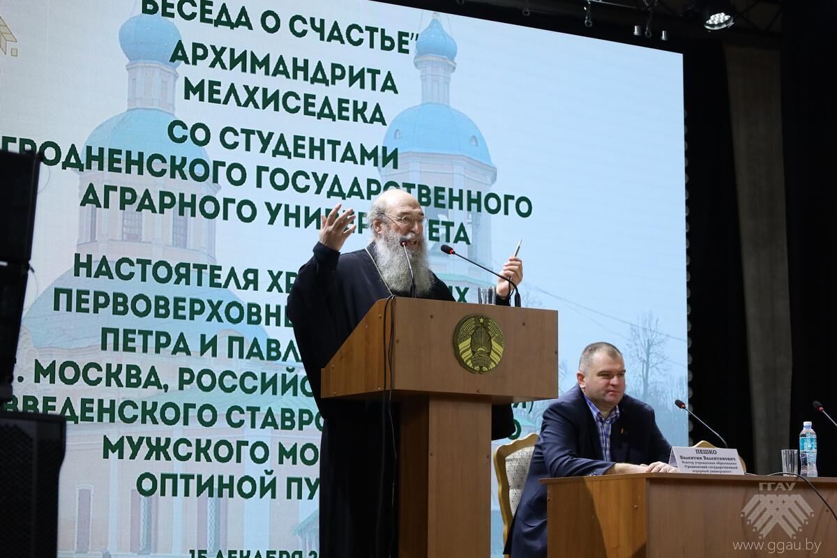 15 декабря в ходе визита в Гродненскую епархию архимандрит Мелхиседек (Артюхин), настоятель храма святых апостолов Петра и Павла в Ясеневе (московского подворья Введенского ставропигиального монастыря Оптина пустынь), пресс-секретарь Синодального отдела Русской Православной Церкви по монастырям и монашеству, посетил Гродненский государственный аграрный университет, где провел встречу с преподавателями и студентами вуза на тему «Беседа о счастье».