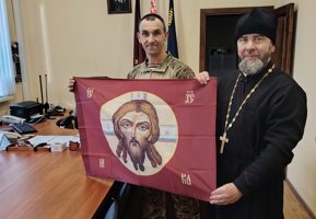 Протоиерей Димитрий встретился с командиром бригады и передал в дар воинской части стяг с изображением иконы Спасителя «Спас Нерукотворный». В ходе общения были обозначены отдельные направления возможного взаимодействия и сотрудничества.