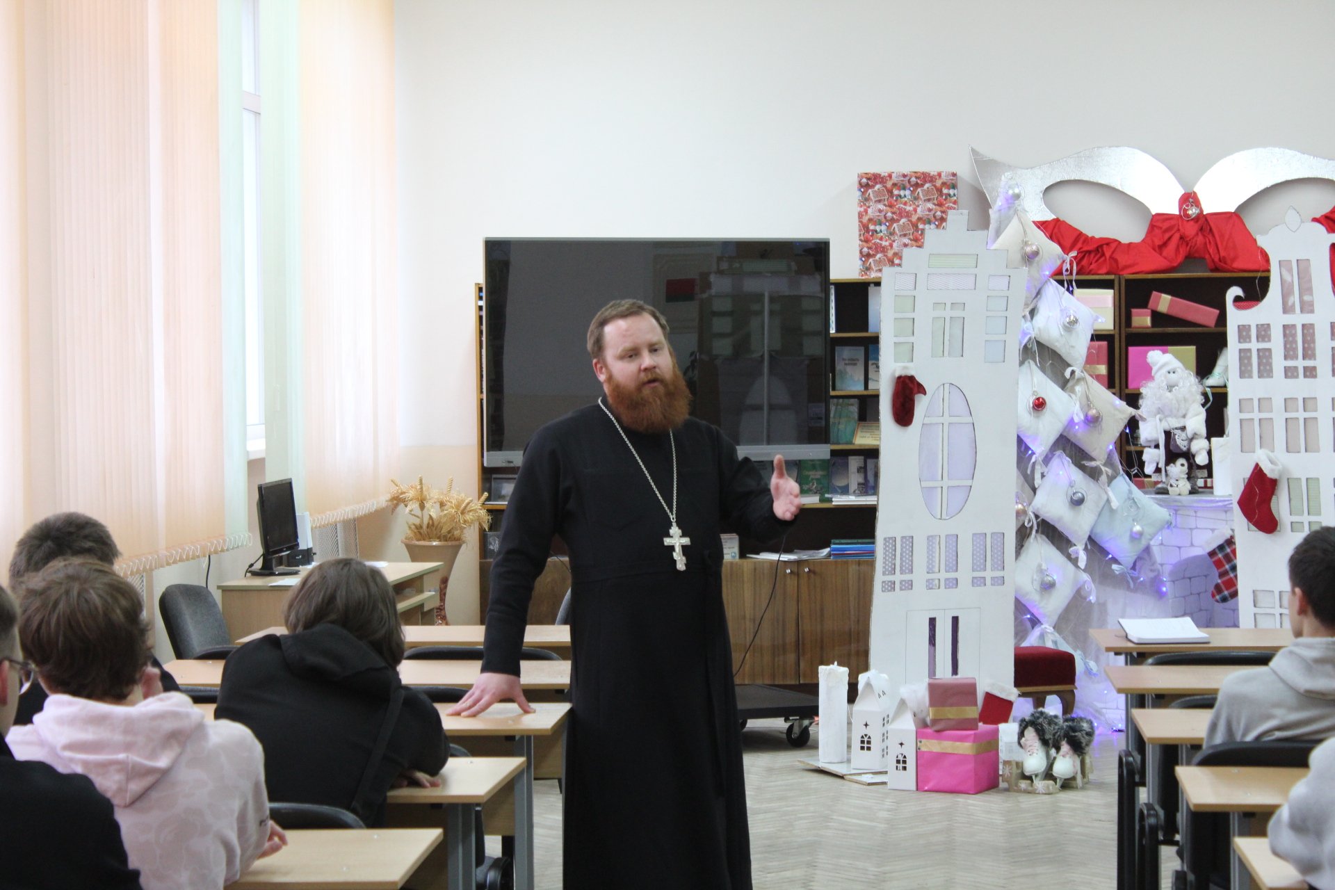 В преддверии праздника Рождества Христова священнослужитель рассказал студентам о духовном смысле праздника и его значении для каждого человека. Во второй части встречи иерей Антоний обратился к ряду вопросов, которые часто остаются без должного осмысления: что собой представляла Вифлеемская звезда, кто такие волхвы, почему отсчет нашей эры ведется от Рождества Христова, а также к другим аспектам евангельского повествования.
