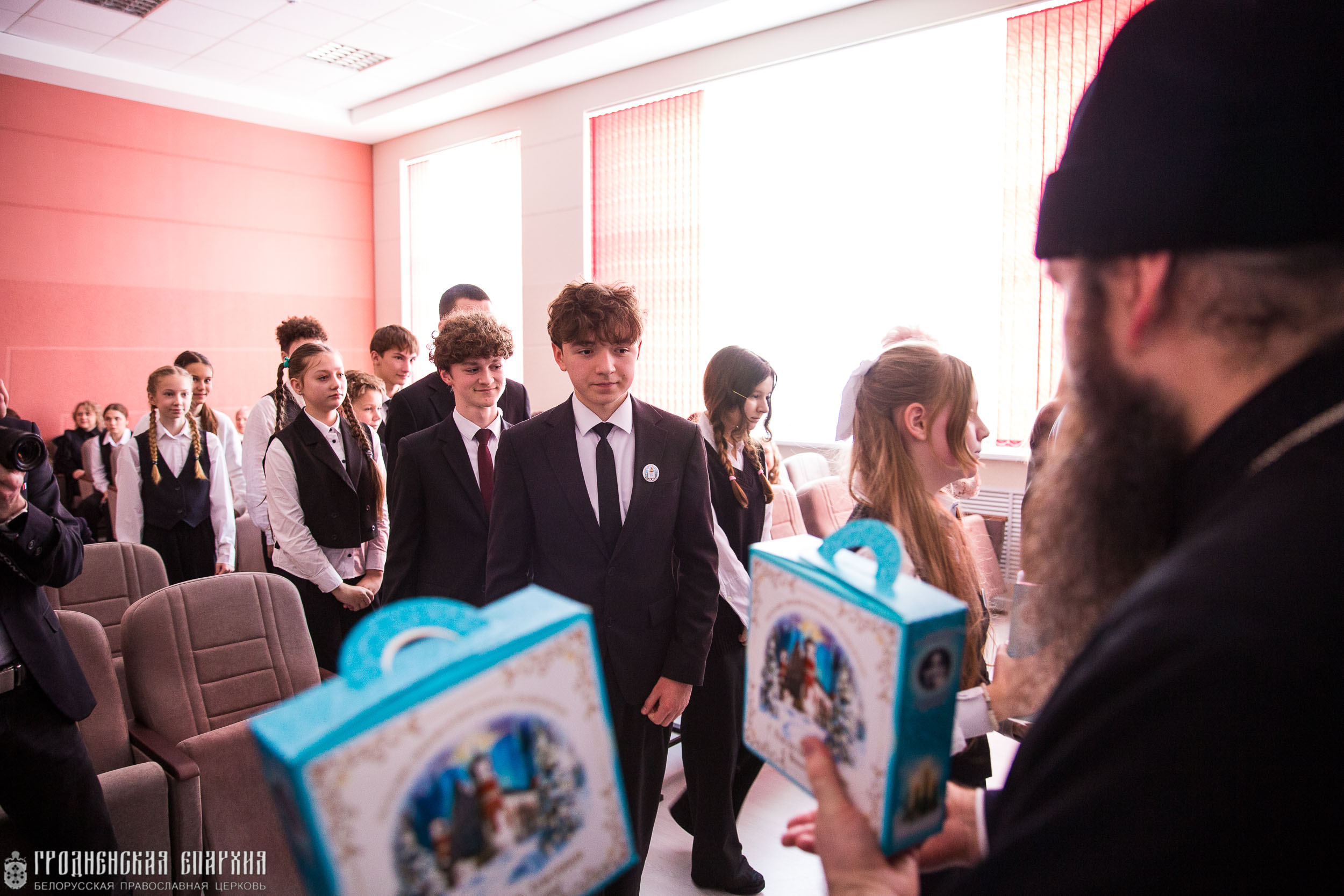 Правящего архиерея Гродненской епархии сопровождали: протоиерей Кирилл Близнюк, благочинный Скидельского церковного округа, настоятель прихода храма святых новомучеников и исповедников земли Белорусской г. Скиделя; иерей Игорь Данильчик, руководитель отдела религиозного образования и катехизации, пресс-секретарь Гродненской епархии, клирик прихода храма святых мучеников благоверных князей Бориса и Глеба г. Гродно; иерей Иоанн Гладун, ответственный за работу с молодежью в Скидельском благочинии, настоятель прихода храма святого благоверного князя Александра Невского аг. Вертелишки Гродненского района; иерей Александр Дежурко, ответственный за духовное окормление средней школы №3 г. Скиделя имени Е.М. Шевченко, клирик прихода храма святых новомучеников и исповедников земли Белорусской г. Скидель; Рада Николаевна Спото, заместитель руководителя епархиального отдела религиозного образования и катехизации.