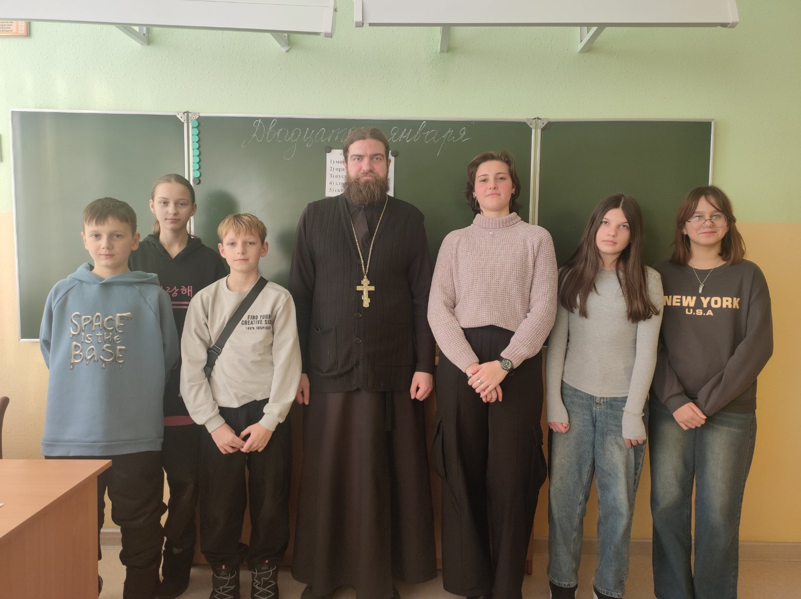 В рамках факультатива «Основы духовно-нравственной культуры и патриотизма» священнослужитель провел беседу с учащимися на тему «Сквернословие — особо тяжелая болезнь речевой культуры». В ходе встречи были затронуты вопросы истории и духовного смысла праздника Богоявления, а также рассмотрено влияние сквернословия на духовное и нравственное состояние человека.