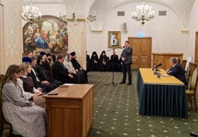 В начале встречи председатель Синодального отдела обратил внимание коллег на ключевые моменты выступления Святейшего Патриарха Московского и всея Руси Кирилла на пленарном заседании XIV Рождественских Парламентских встреч в Совете Федерации Федерального Собрания Российской Федерации и на пленарном заседании XXXIV Международных Рождественских образовательных чтений в Государственном Кремлевском дворце.