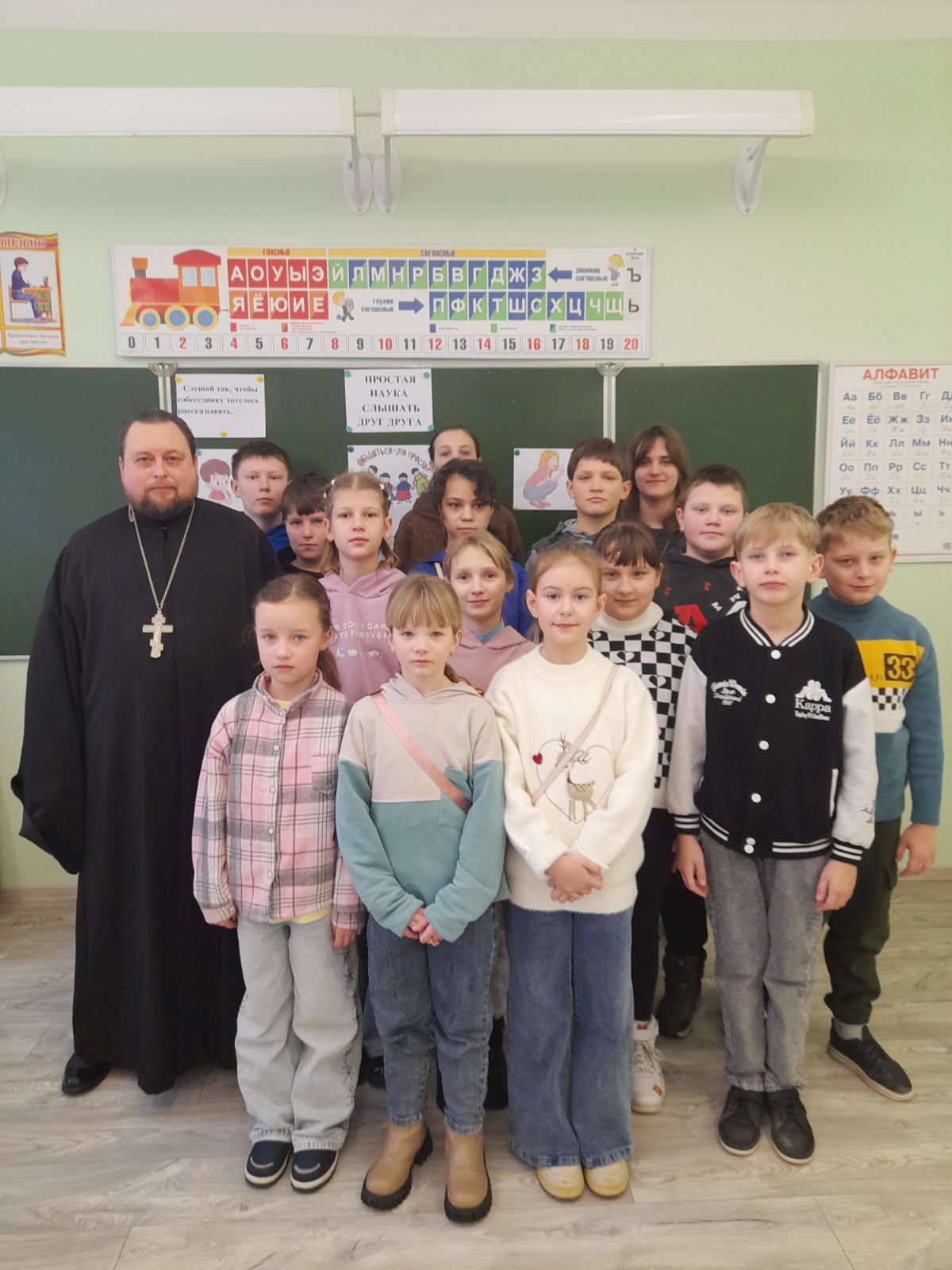 Священнослужитель провел с учащимися беседу на тему «Простая наука слышать друг друга». В ходе встречи школьники размышляли о дружбе, взаимоуважении, умении выслушать собеседника и проявить терпение. На примере евангельской притчи о блудном сыне иерей Александр рассказал о милосердии Божием, покаянии и радости прощения.