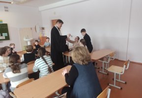 11 февраля отец Владимир совершил освящение школы и посетил каждый класс, окропив учащихся святой водой.