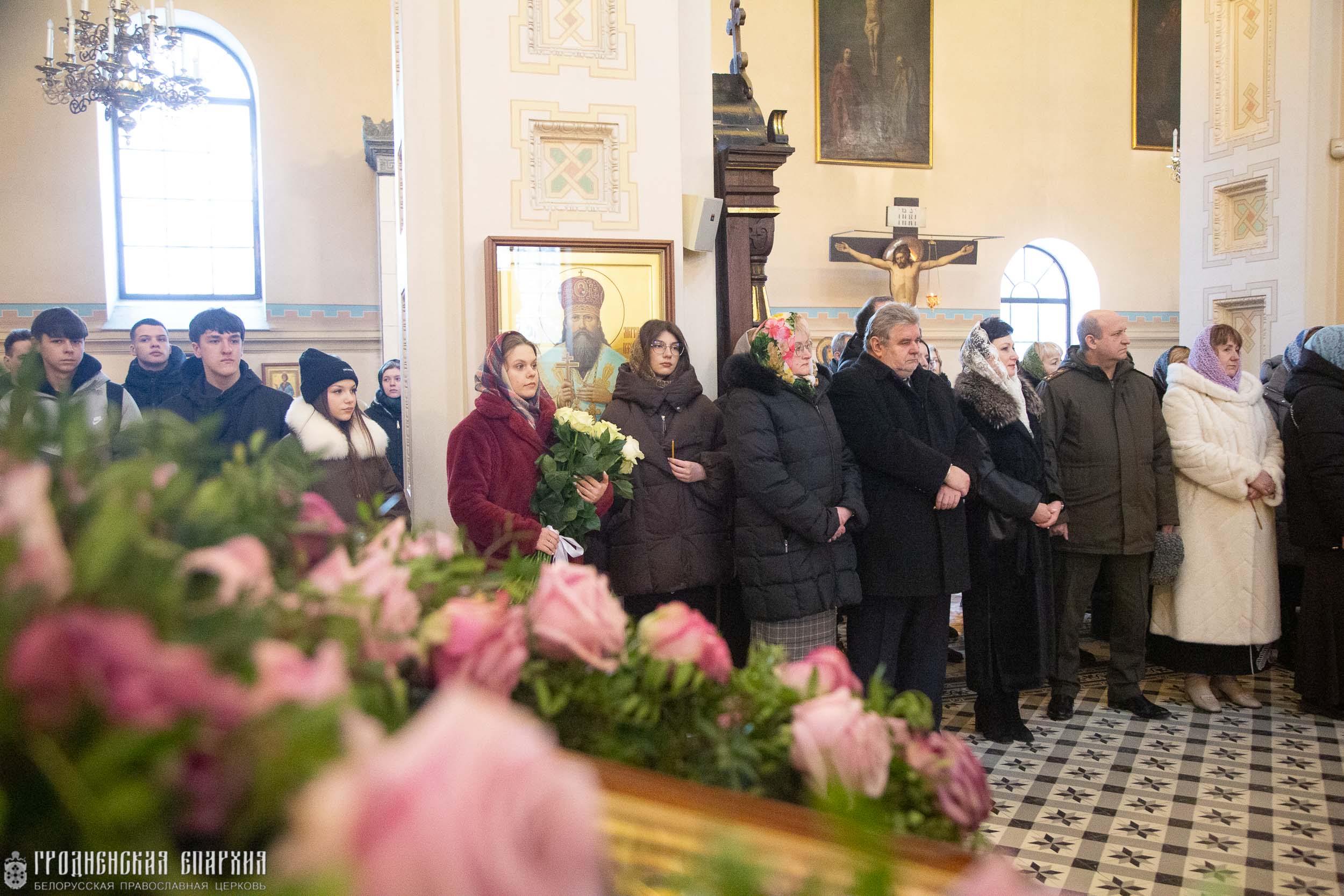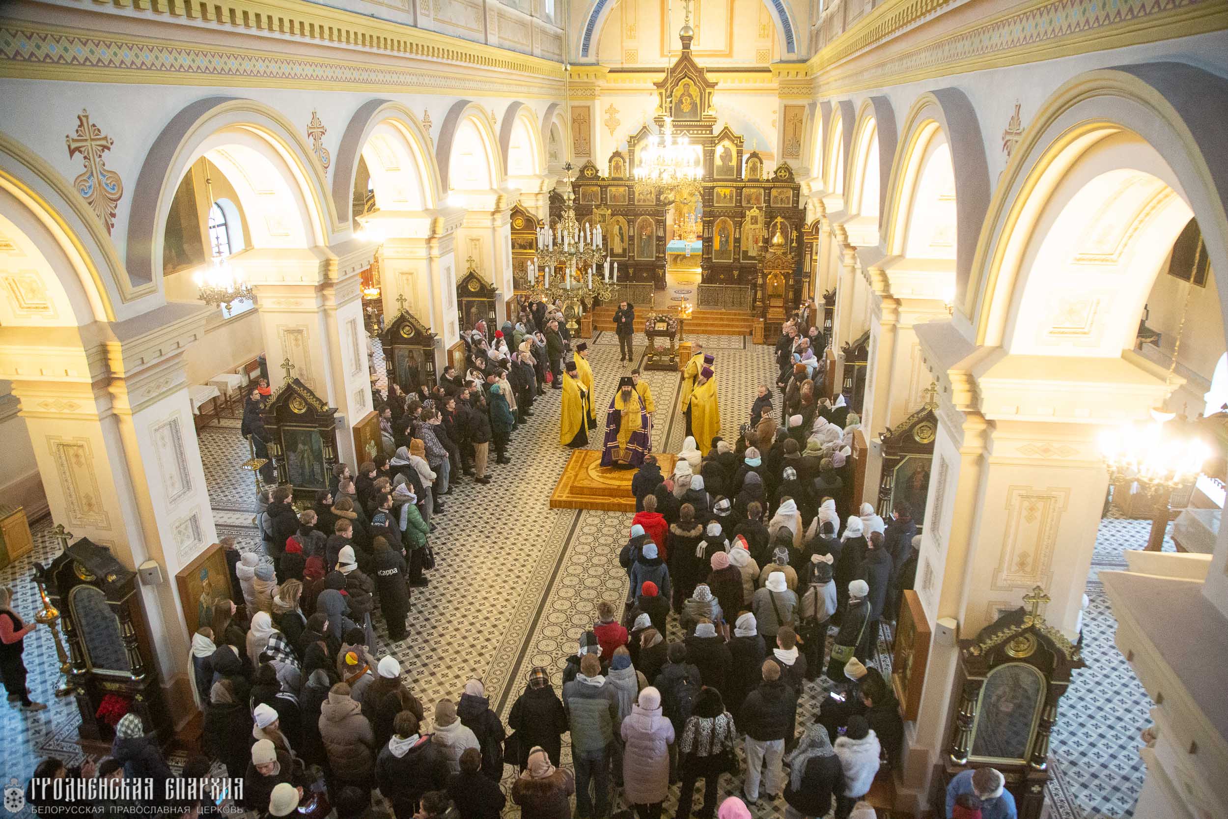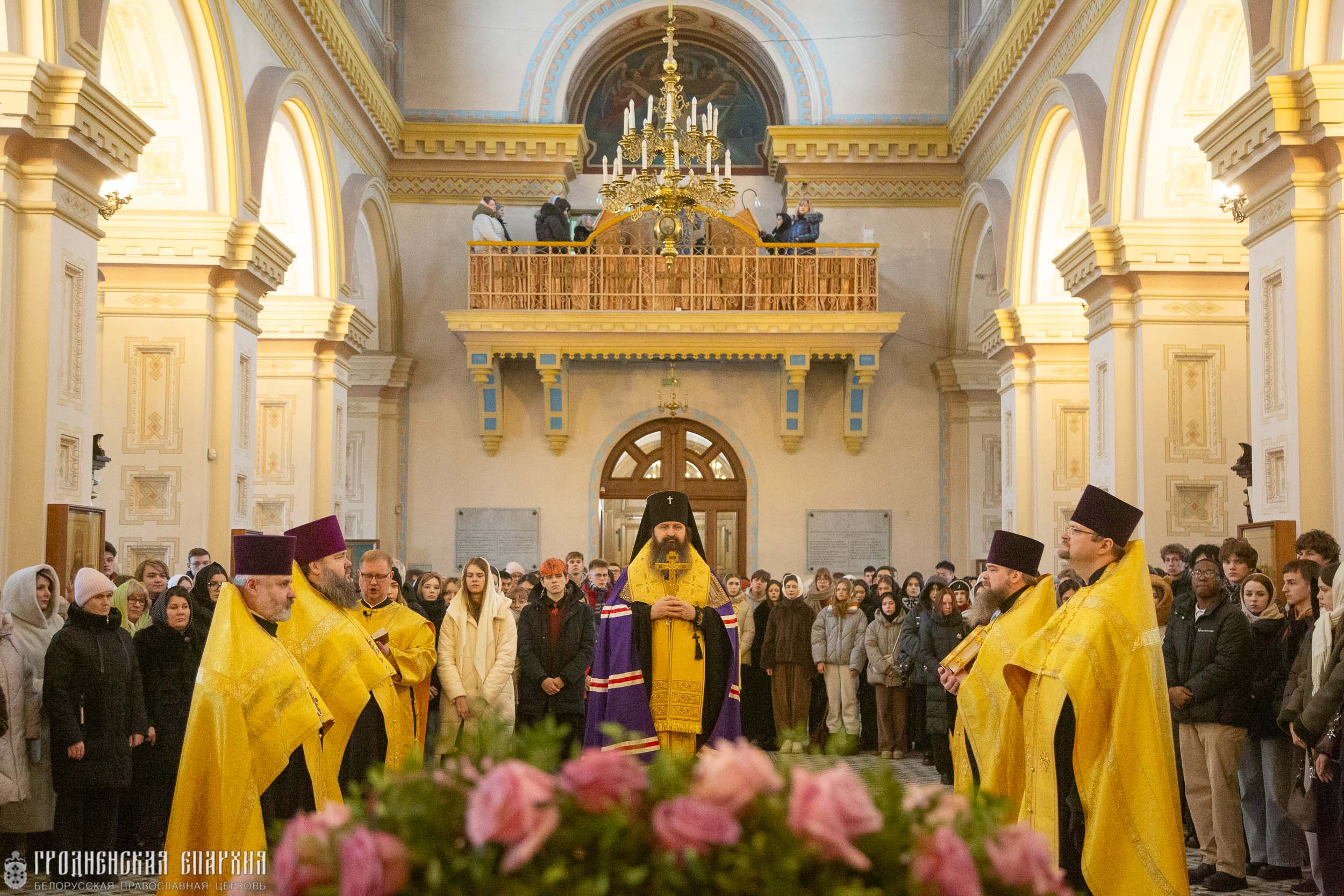 Его Высокопреосвященству сослужили: протоиерей Николай Лабынько, Секретарь Гродненской епархии, настоятель прихода храма святого благоверного князя Александра Невского г. Гродно; протоиерей Григорий Беляцкий, настоятель кафедрального собора Покрова Пресвятой Богородицы; протоиерей Александра Болонников, ответственный за взаимодействие Гродненской епархии с ГрГУ имени Янки Купалы, настоятель прихода храма святых мучеников благоверных князей Бориса и Глеба г. Гродно; иерей Игорь Данильчик, руководитель отдела религиозного образования и катехизации, пресс-секретарь Гродненской епархии, клирик прихода храма святых мучеников благоверных князей Бориса и Глеба г. Гродно.