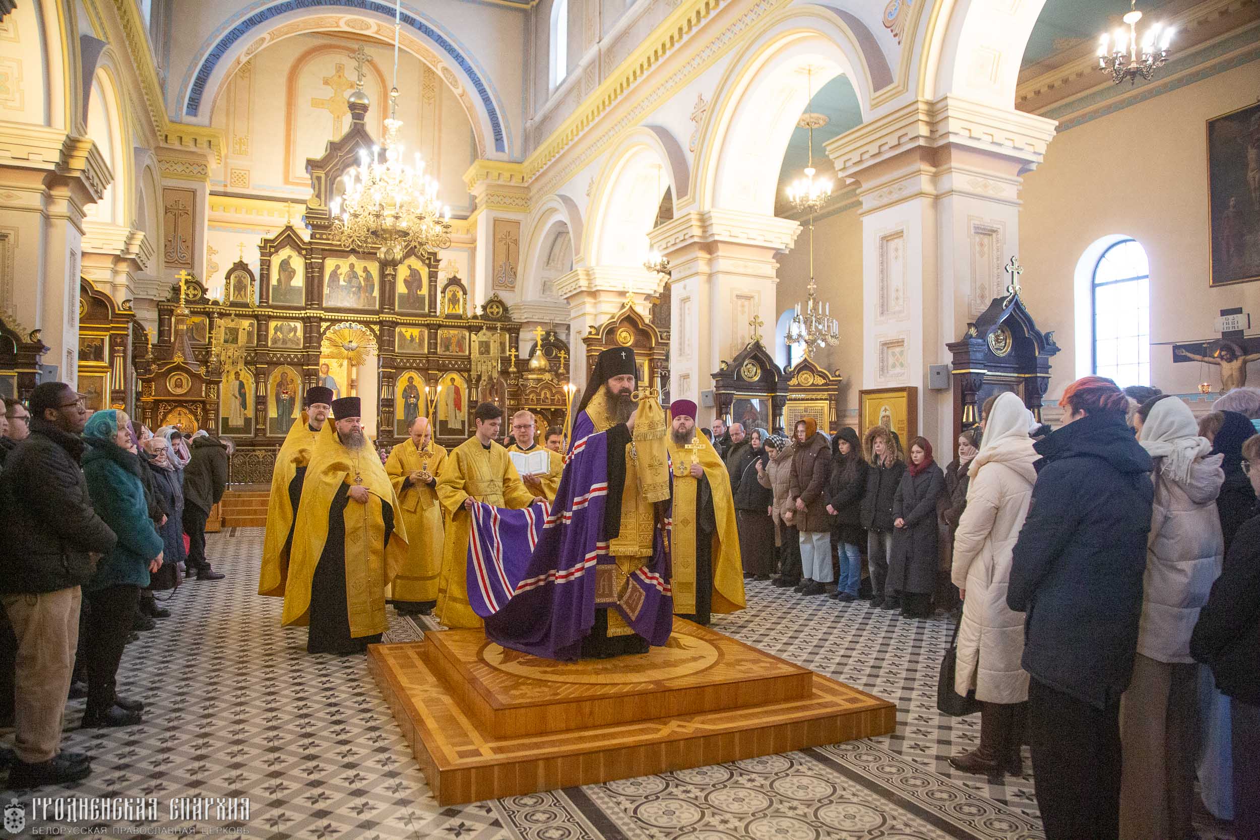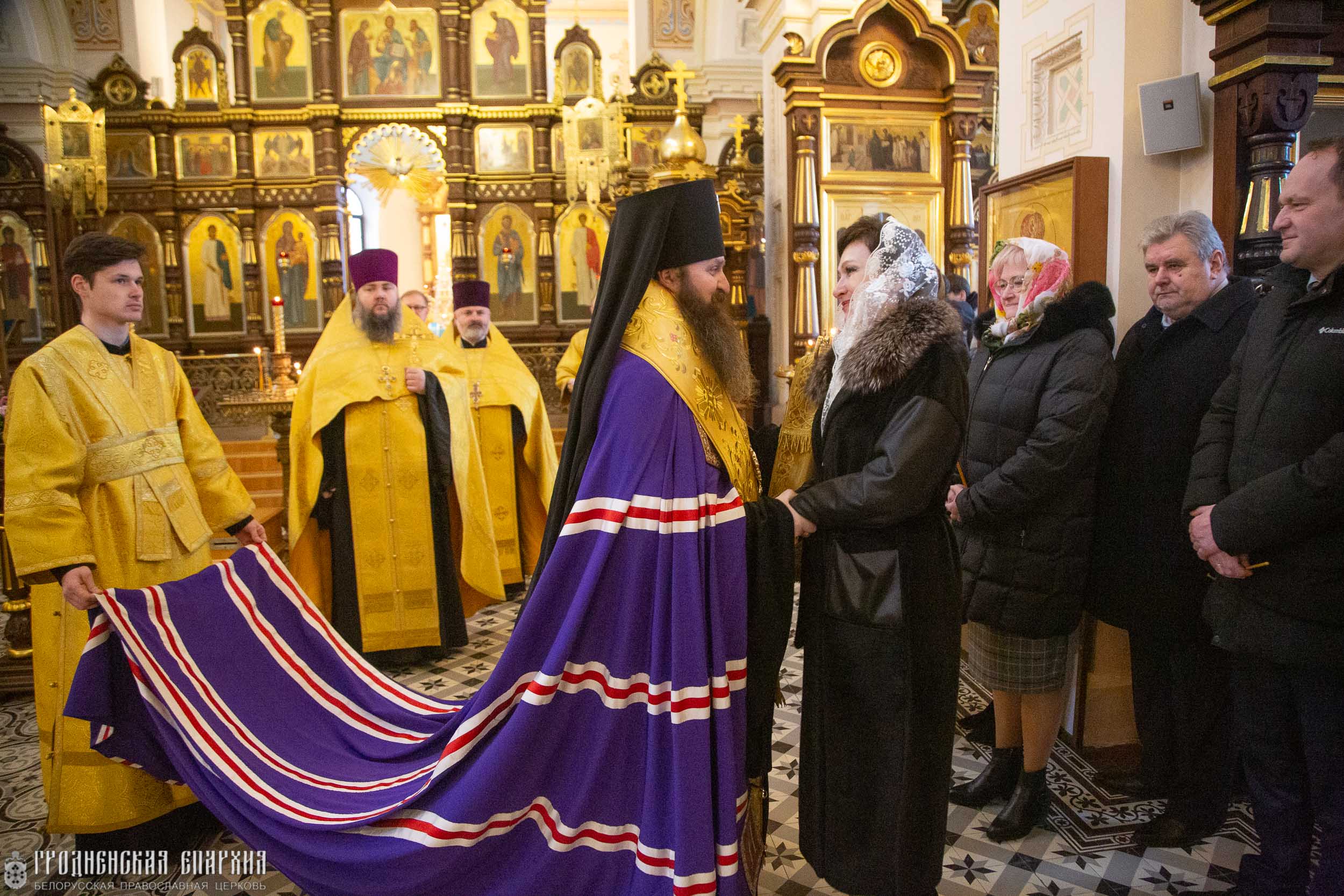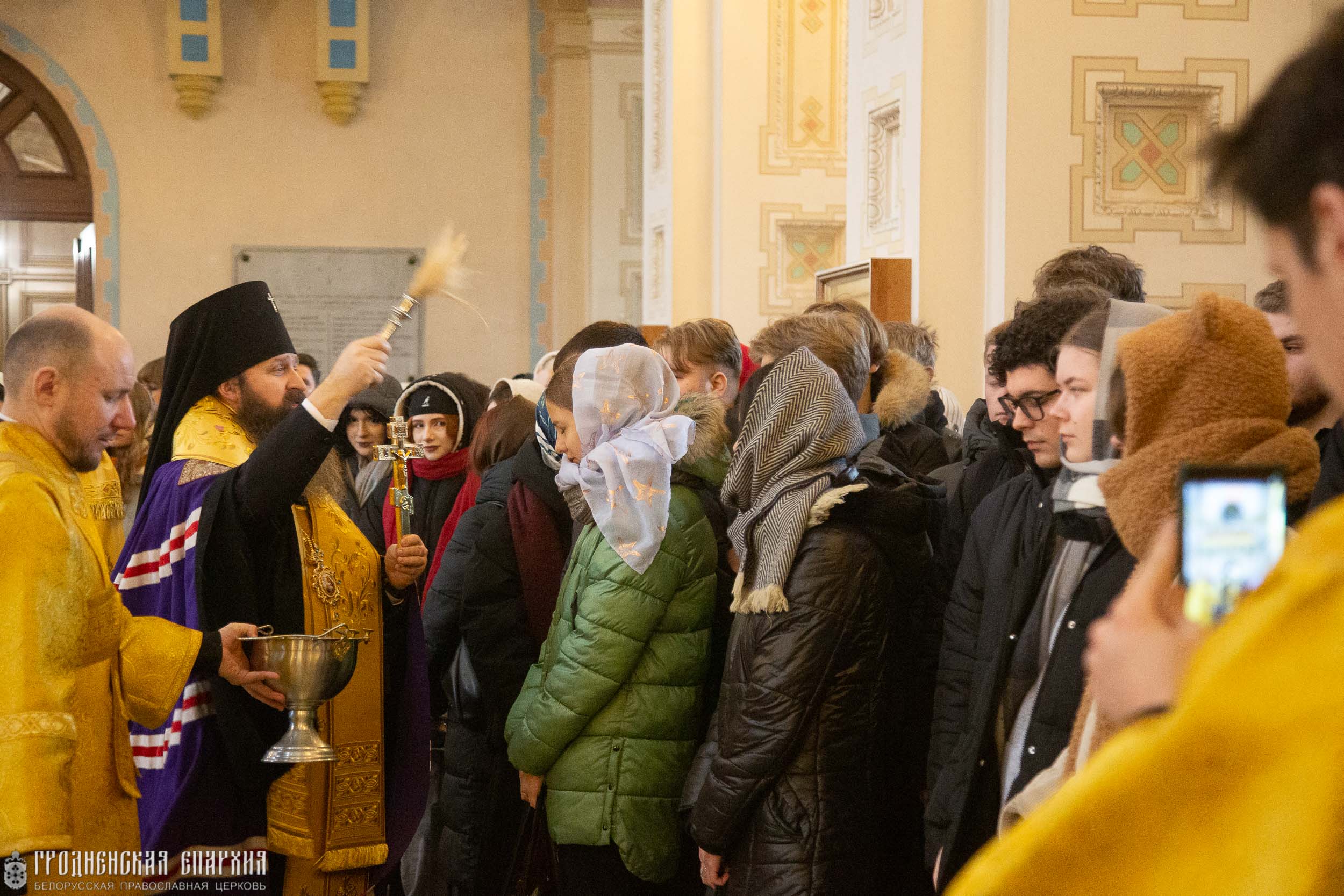 Его Высокопреосвященству сослужили: протоиерей Николай Лабынько, Секретарь Гродненской епархии, настоятель прихода храма святого благоверного князя Александра Невского г. Гродно; протоиерей Григорий Беляцкий, настоятель кафедрального собора Покрова Пресвятой Богородицы; протоиерей Александра Болонников, ответственный за взаимодействие Гродненской епархии с ГрГУ имени Янки Купалы, настоятель прихода храма святых мучеников благоверных князей Бориса и Глеба г. Гродно; иерей Игорь Данильчик, руководитель отдела религиозного образования и катехизации, пресс-секретарь Гродненской епархии, клирик прихода храма святых мучеников благоверных князей Бориса и Глеба г. Гродно.