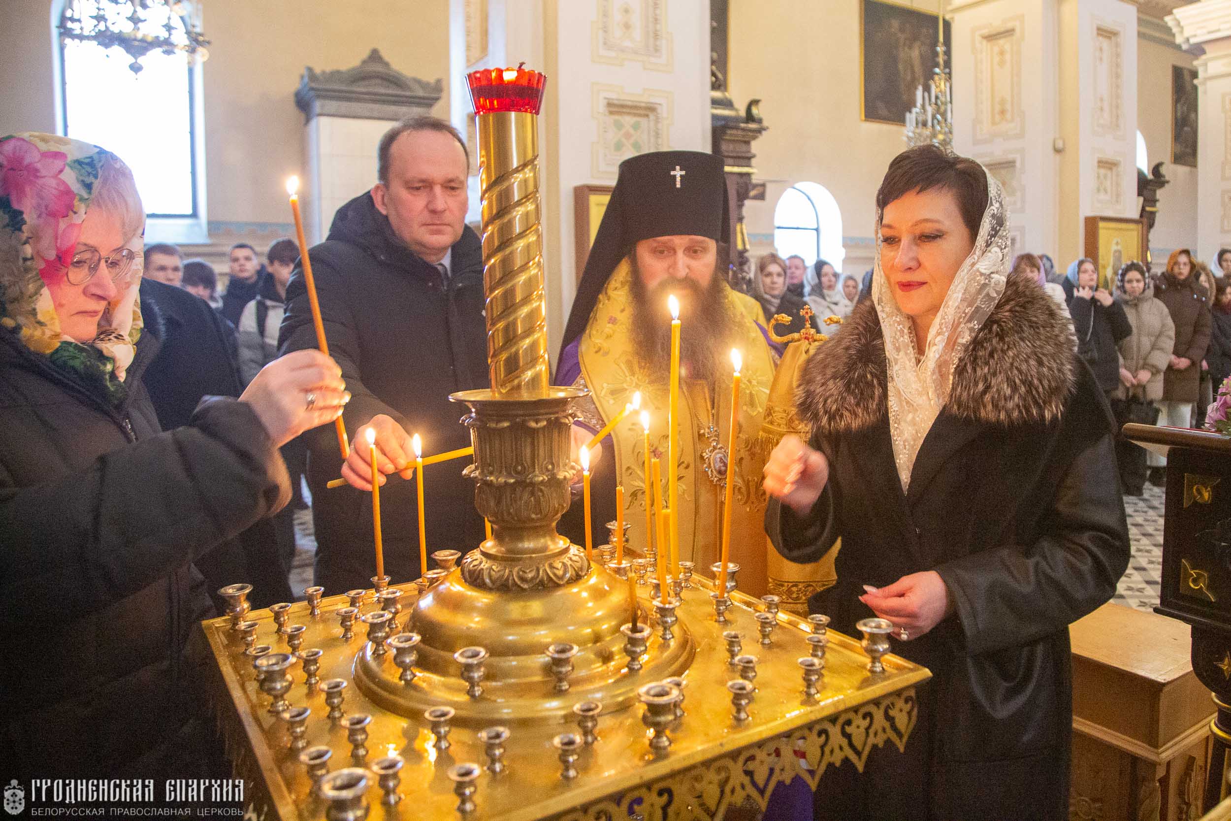 Перед началом молебна архиепископ Антоний, ректор ГрГУ имени Янки Купалы Ирина Китурко и сотрудники аппарата управления университета затеплили свечи у иконы праздника Сретения Господня на центральном аналое кафедрального собора.