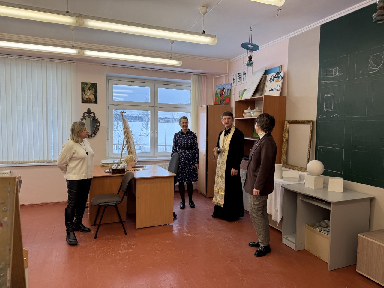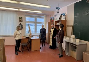 После встречи с руководством и педагогическим коллективом школы священнослужитель совершил освящение здания учебного заведения. В ходе беседы с педагогами и учащимися священник преподал благословение на успехи в учебе и плодотворную работу.