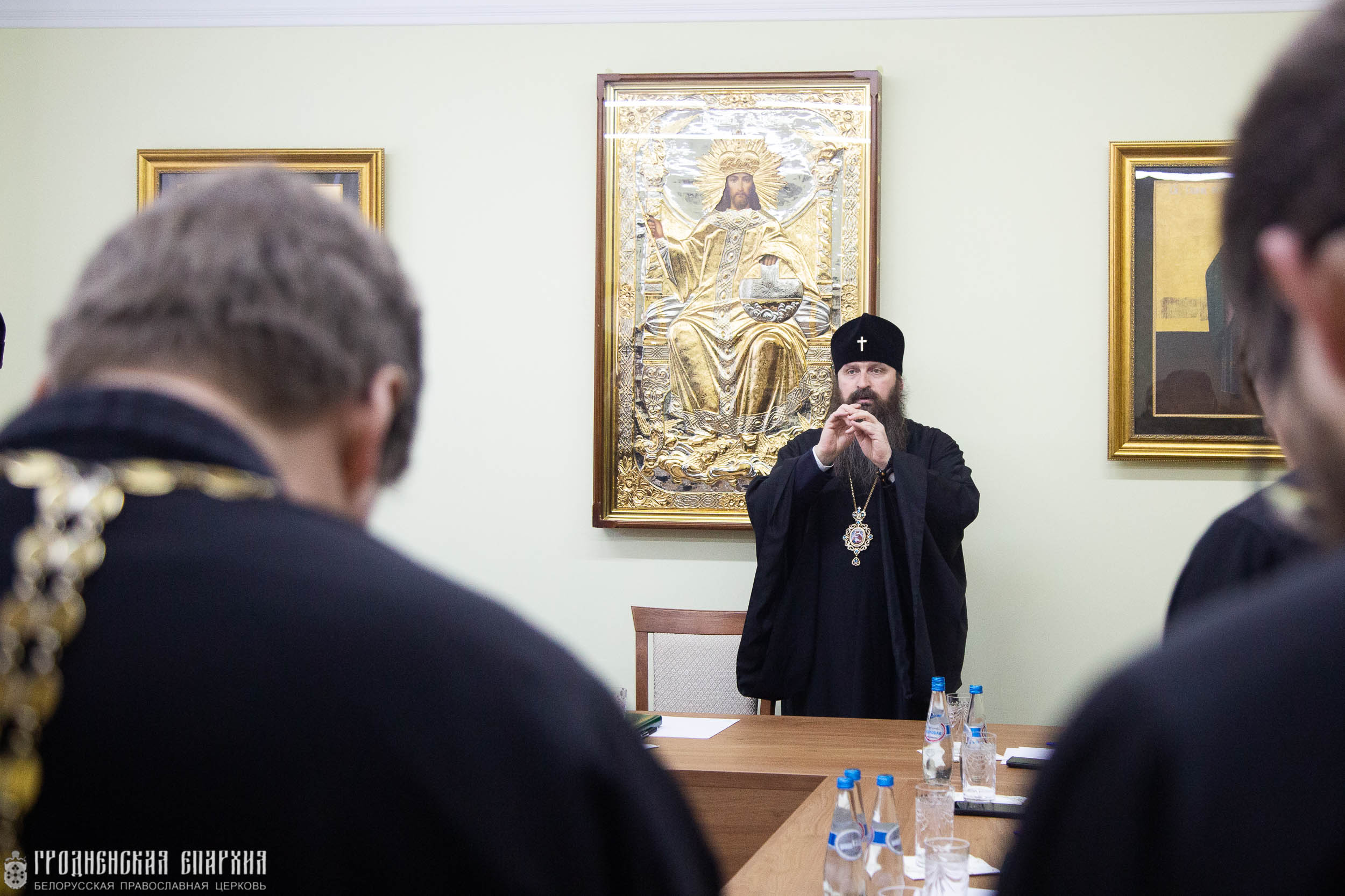 а также приглашенные участники: протоиерей Григорий Викторович Беляцкий, настоятель прихода кафедрального собора Покрова Пресвятой Богородицы г. Гродно, председатель Аттестационно-дисциплинарной комиссии Гродненской епархии; протоиерей Владимир Павлович Саверченко, благочинный Мостовского церковного округа, настоятель прихода храма иконы Божией Матери «Всех скорбящих Радость» г. Мосты; протоиерей Кирилл Леонтьевич Близнюк, благочинный Скидельского церковного округа, настоятель прихода храма святых новомучеников и исповедников земли Белорусской г. Скиделя, председатель Попечительской комиссии Гродненской епархии; иерей Александр Иванович Пастерняк, благочинный Щучинского церковного округа, настоятель прихода храма святого Архангела Михаила г. Щучина; иерей Александр Анатольевич Юзва, благочинный Волковысского церковного округа, настоятель прихода храма святых равноапостольных Мефодия и Кирилла, учителей Словенских, г. Волковыска.