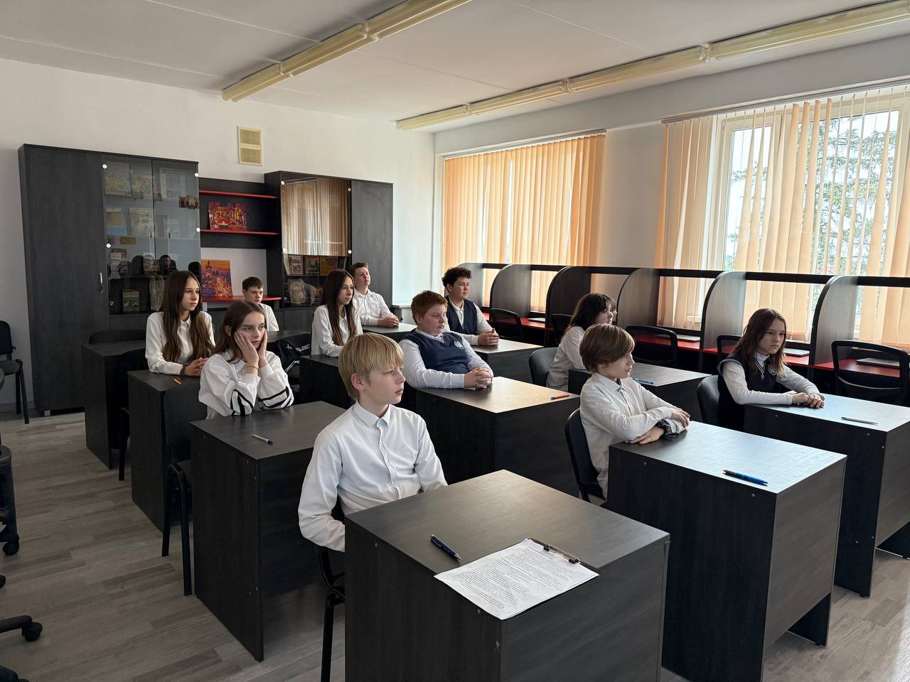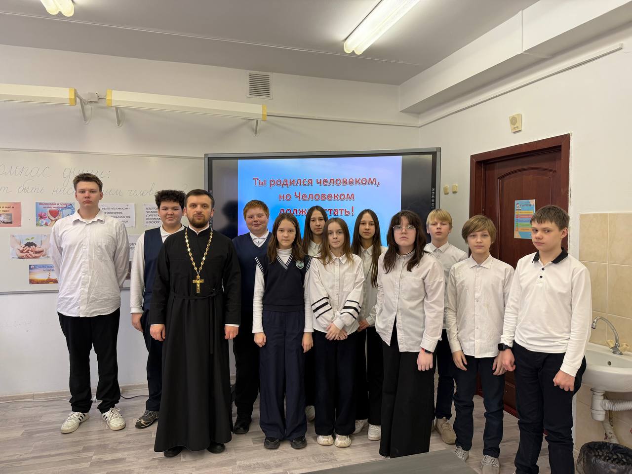 Священнослужитель принял участие в тематическом классном часе «Компас души: что значит быть настоящим человеком?» для учащихся 7 класса. В ходе беседы школьники обсуждали качества, составляющие основу достойной личности. Иерей Александр Цыбульский привел примеры из жизни и истории, помогая ребятам задуматься о важности следования голосу совести.