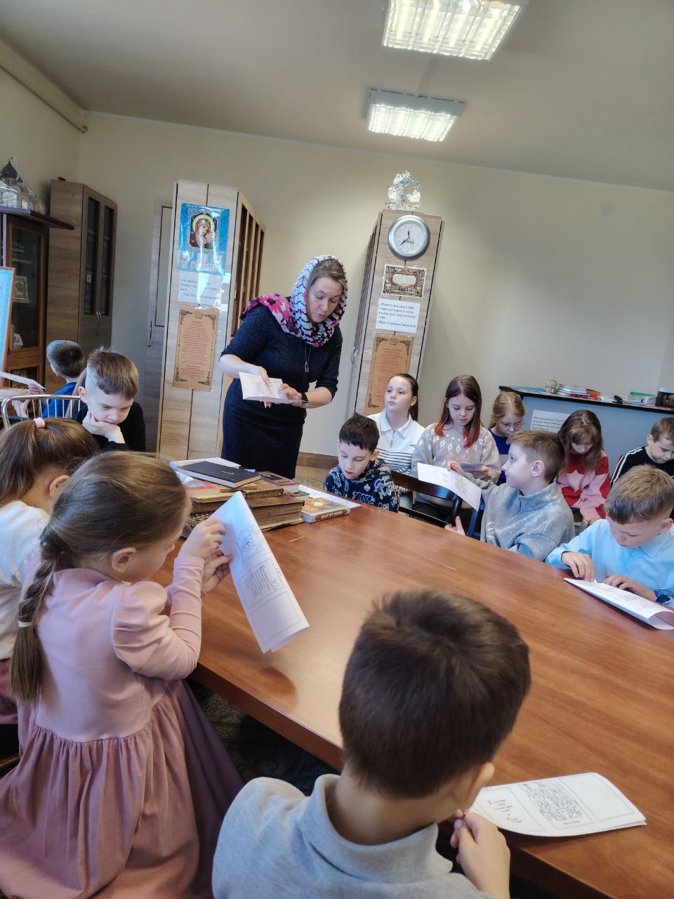 В ходе урока обсуждалось, какие книги уместно иметь в христианской семье. В доступной форме детям рассказали о значении Евангелия, Псалтири и молитвословов. Завершилось занятие практической частью: каждый ребенок изготовил свой первый самодельный молитвослов.