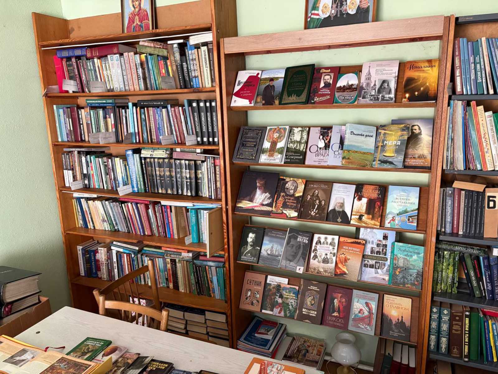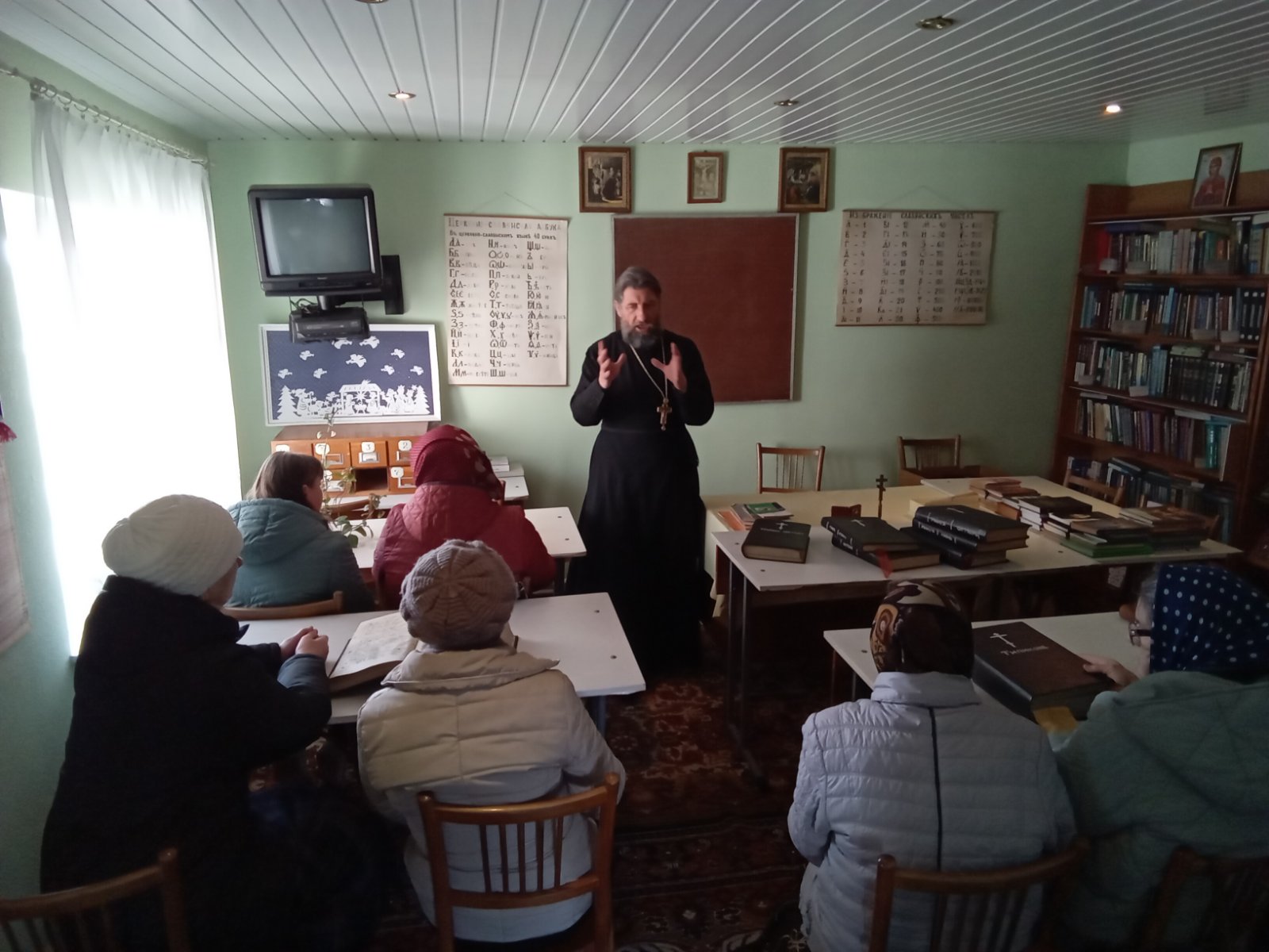 Священник поблагодарил прихожан, пожертвовавших книги для библиотеки. Фонд также пополняется новыми изданиями, приобретаемыми за счет пожертвований.