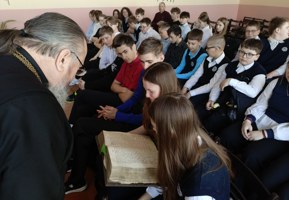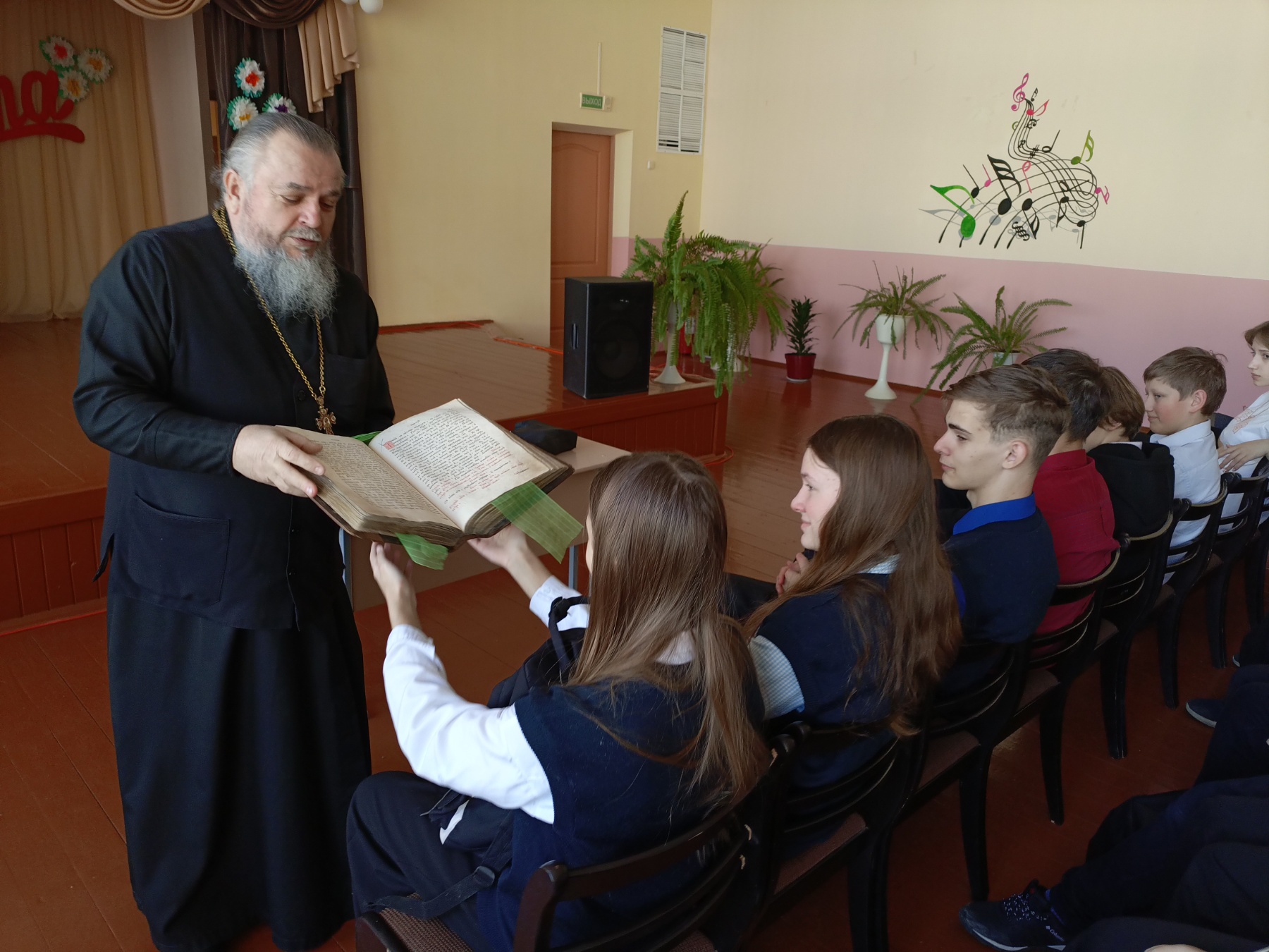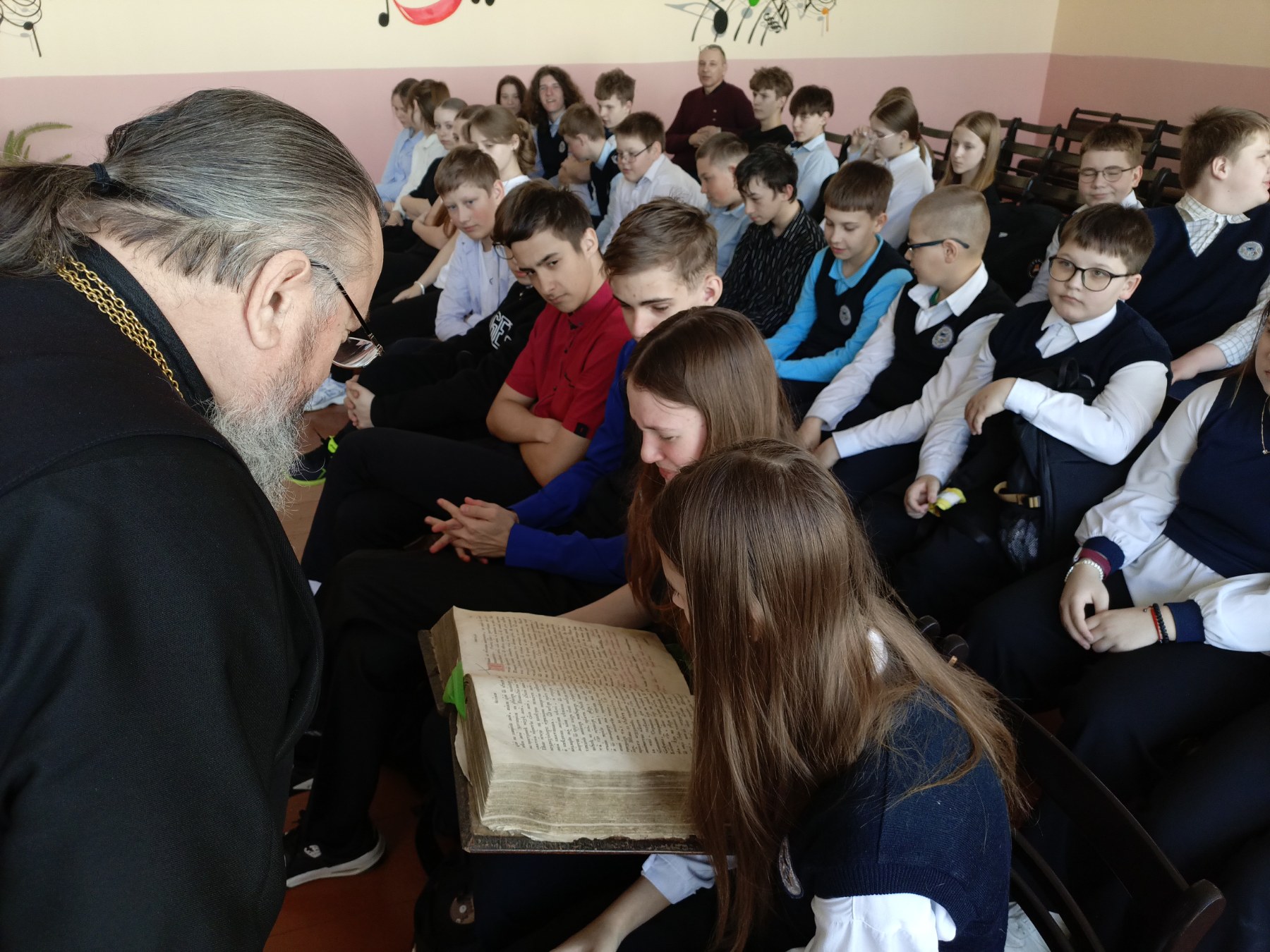 Он показал старинную книгу XIX века, рассказав о ее происхождении и значении для людей. Ученики с интересом изучали церковный фолиант, пробовали читать и представляли, как трудно было бы носить в школу несколько таких тяжелых томов в наше время.