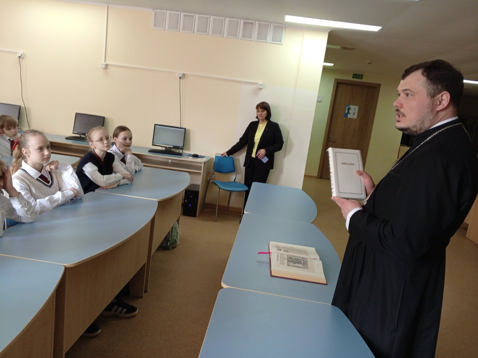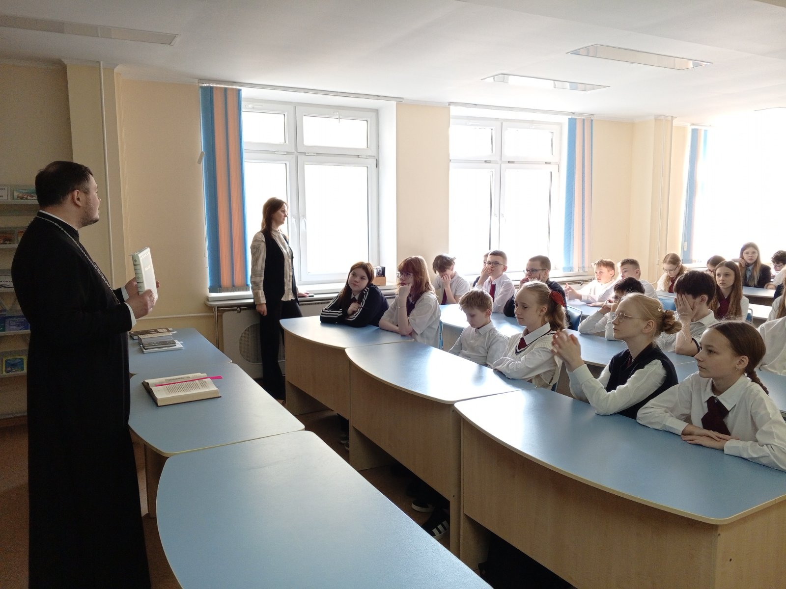 Встреча была посвящена Библии — Книге, оказавшей определяющее влияние на развитие всей человеческой цивилизации. В общении со школьниками отец Александр раскрыл понятие Божественного откровения и объяснил, в чем заключаются главные смыслы и непреходящая ценность Священного Писания.