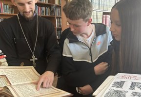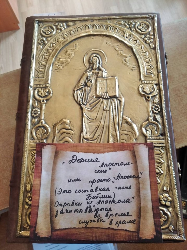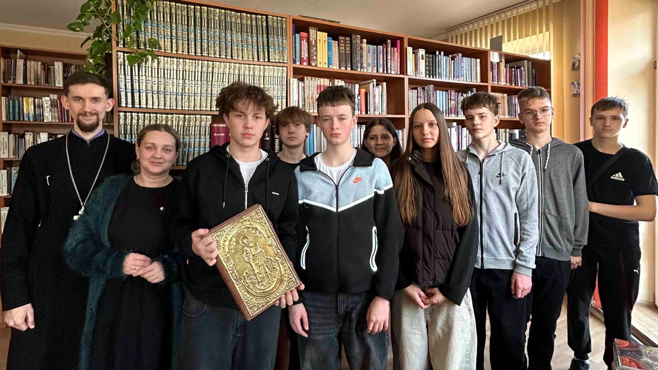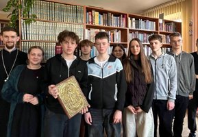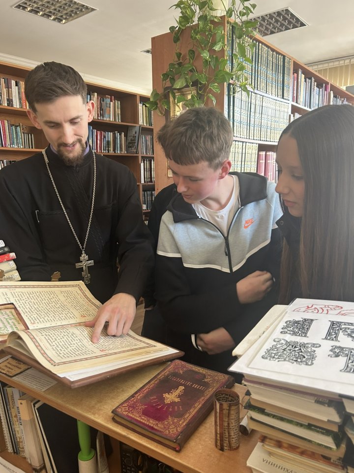 Библиотекарь Ольга Байда рассказала гимназистам об истоках книгопечатания и трудоемкости переписывания книг в древности. Школьники вспомнили о просветительском подвиге святых равноапостольных Кирилла и Мефодия. Особый интерес вызвало знакомство с первой печатной книгой «Апостол».