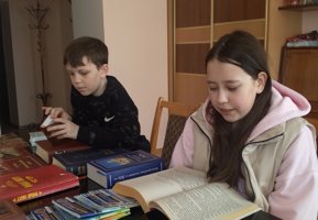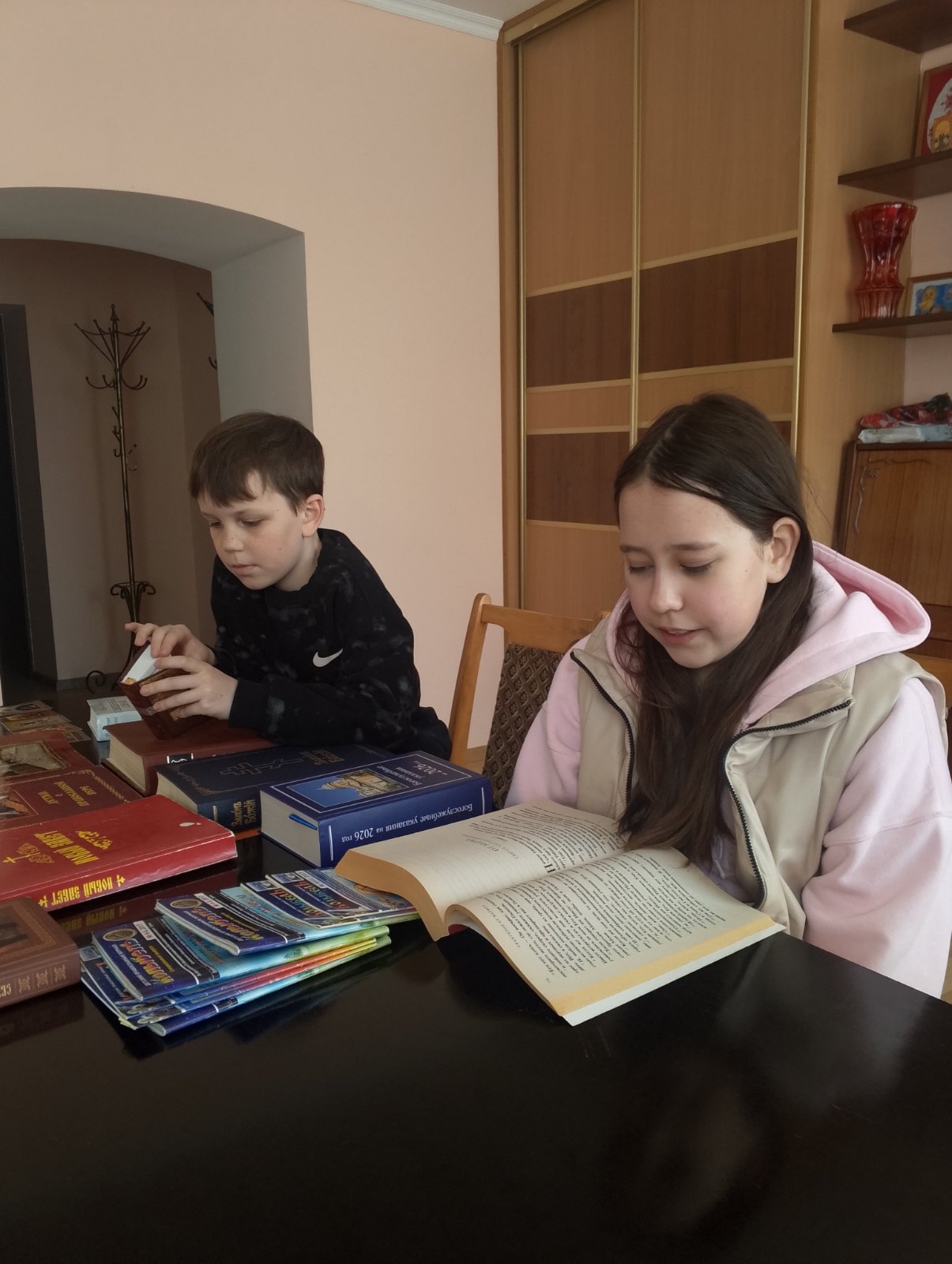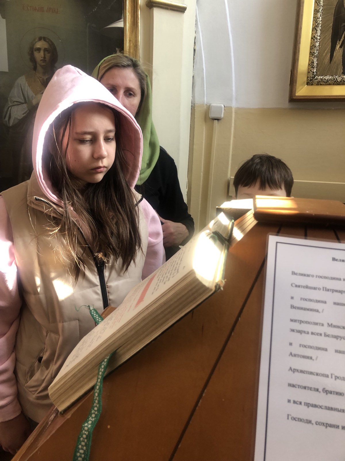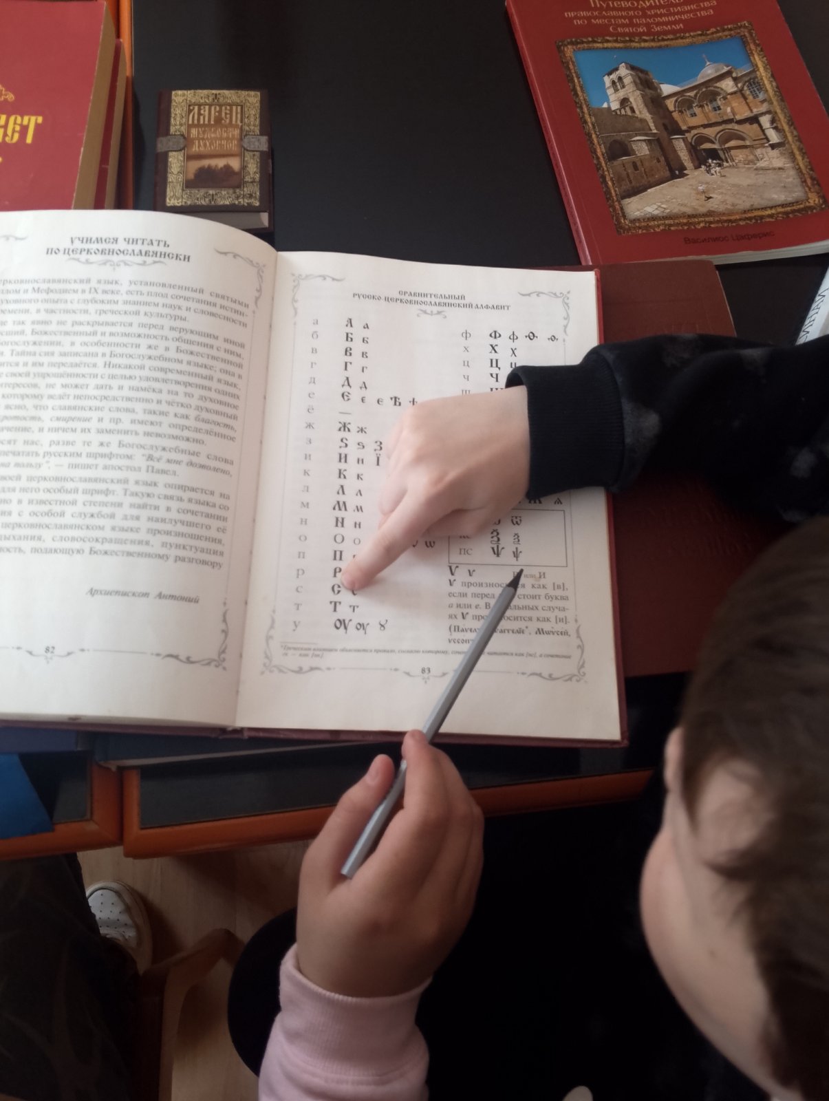 Занятие продолжилось в храме, где дети познакомились с богослужебными книгами и попробовали читать на церковнославянском языке. Учащиеся узнали, что богослужебная литература является неотъемлемой частью православных служб и помогает верующим понимать смысл богослужений.