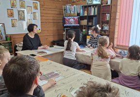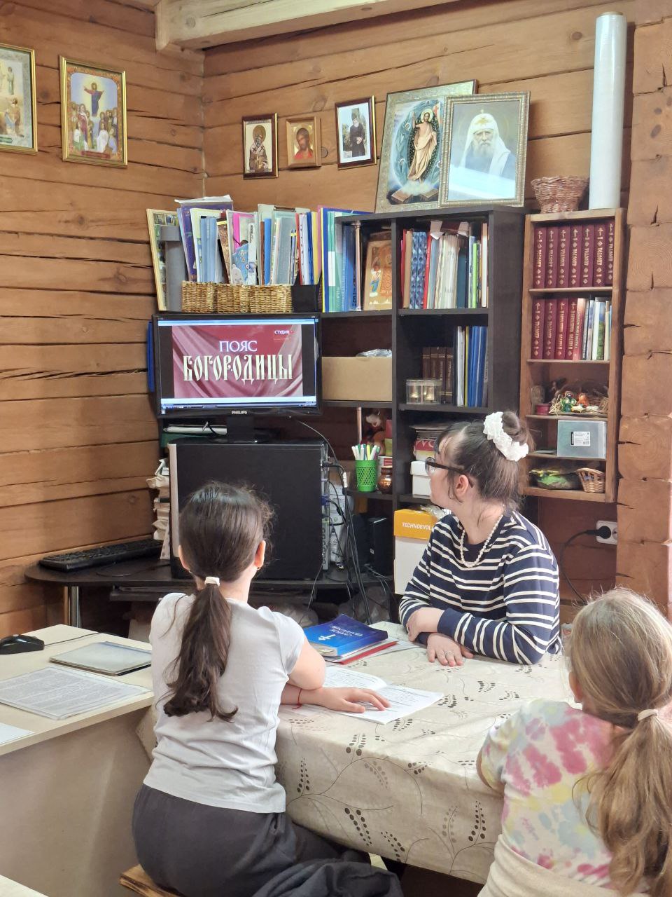 Дети посмотрели документальный фильм «Пояс Богородицы», узнали об истории святыни и о чудесах, происходивших по молитвам верующих перед Поясом Божией Матери. Также воспитанникам было рассказано, что вместе с Поясом Пресвятой Богородицы для поклонения будут принесены частицы честных мощей святых праведных Иоакима и Анны.
