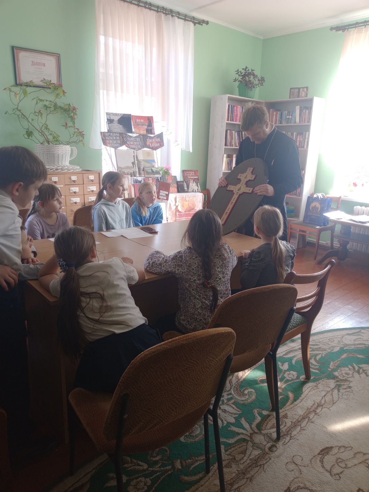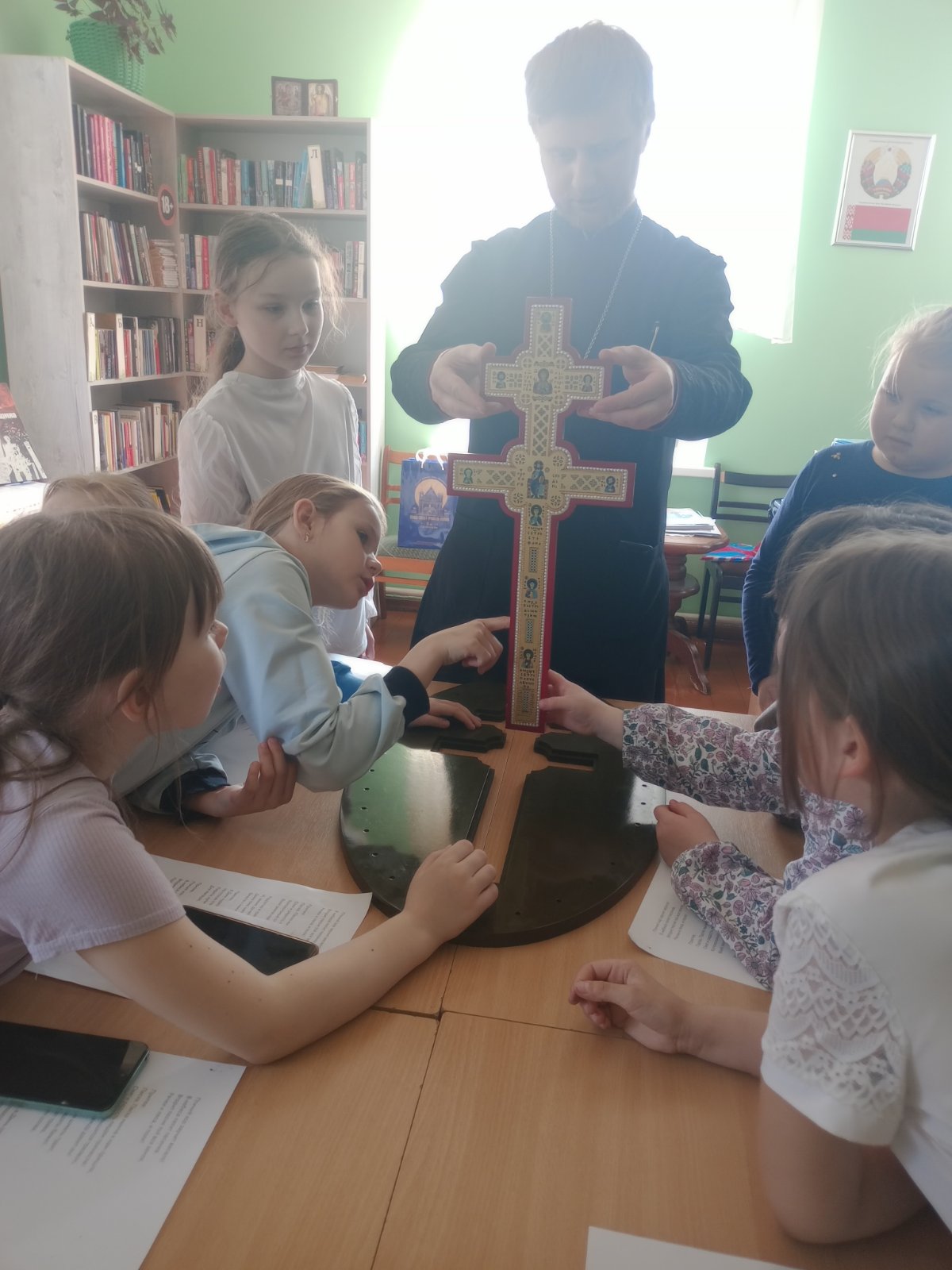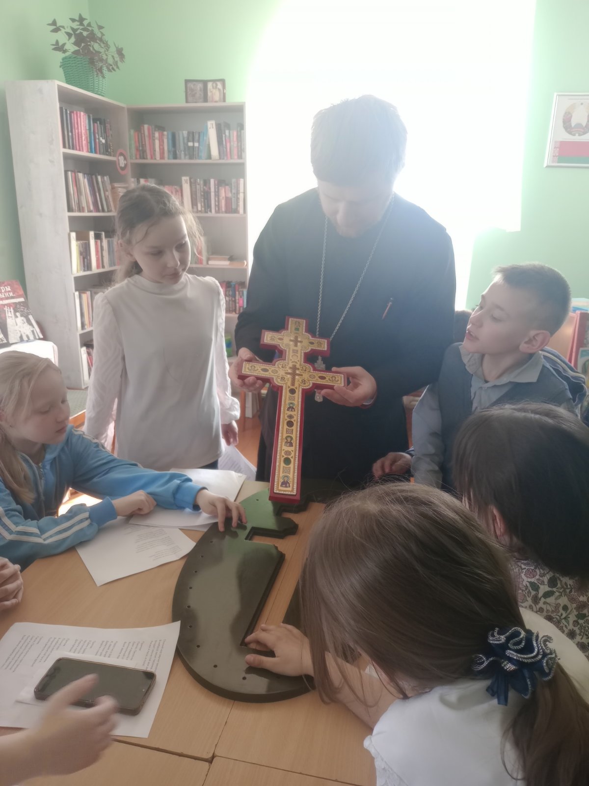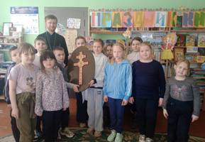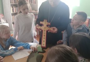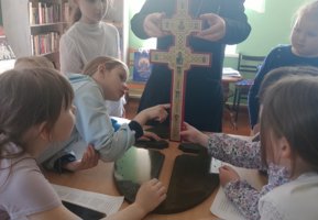 Клирик храма иерей Виталий Шостыр рассказал юным слушателям об истории создания напрестольного креста мастером Лазарем Богшей и о святынях, которые в нем хранились. Во время занятия была продемонстрирована копия креста, и учащиеся смогли приложиться к ней и рассмотреть святыню.