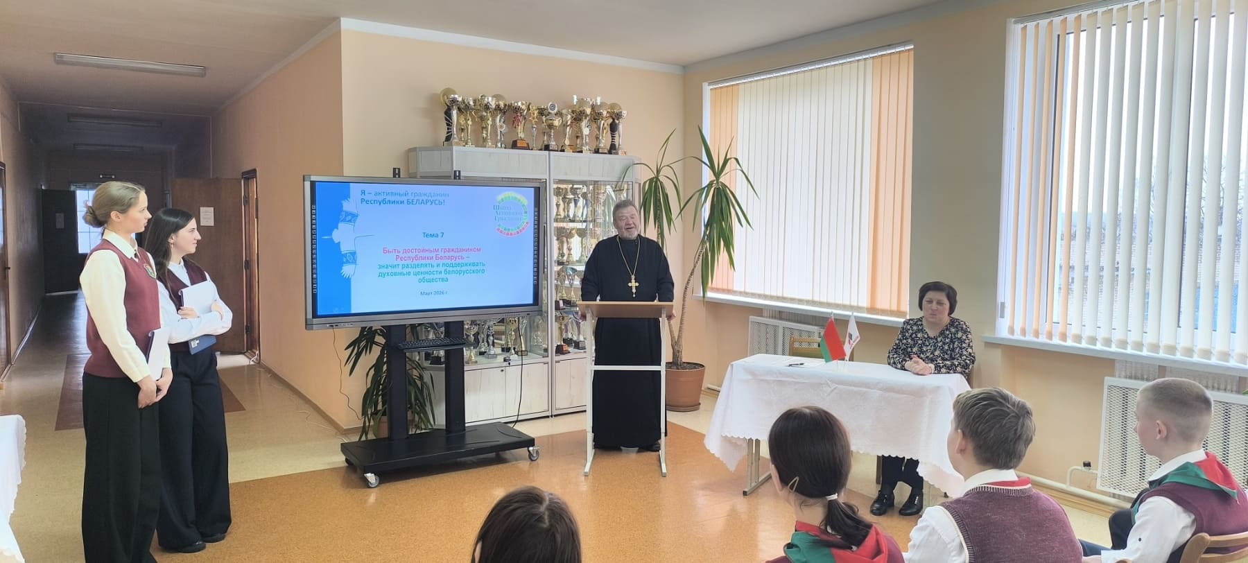 В мероприятии принял участие настоятель прихода храма Рождества Пресвятой Богородицы аг. Гудевичи Мостовского района протоиерей Николай Сень. Священнослужитель обратился к участникам встречи с пастырским словом о значении духовно-нравственных ориентиров в жизни современного человека, подчеркнув важность сохранения православных традиций как основы гражданской ответственности и патриотизма. Педагогии учреждения дошкольного образования и приглашенные гости обсудили роль семьи, веры и культуры в формировании активной гражданской позиции у подрастающего поколения.