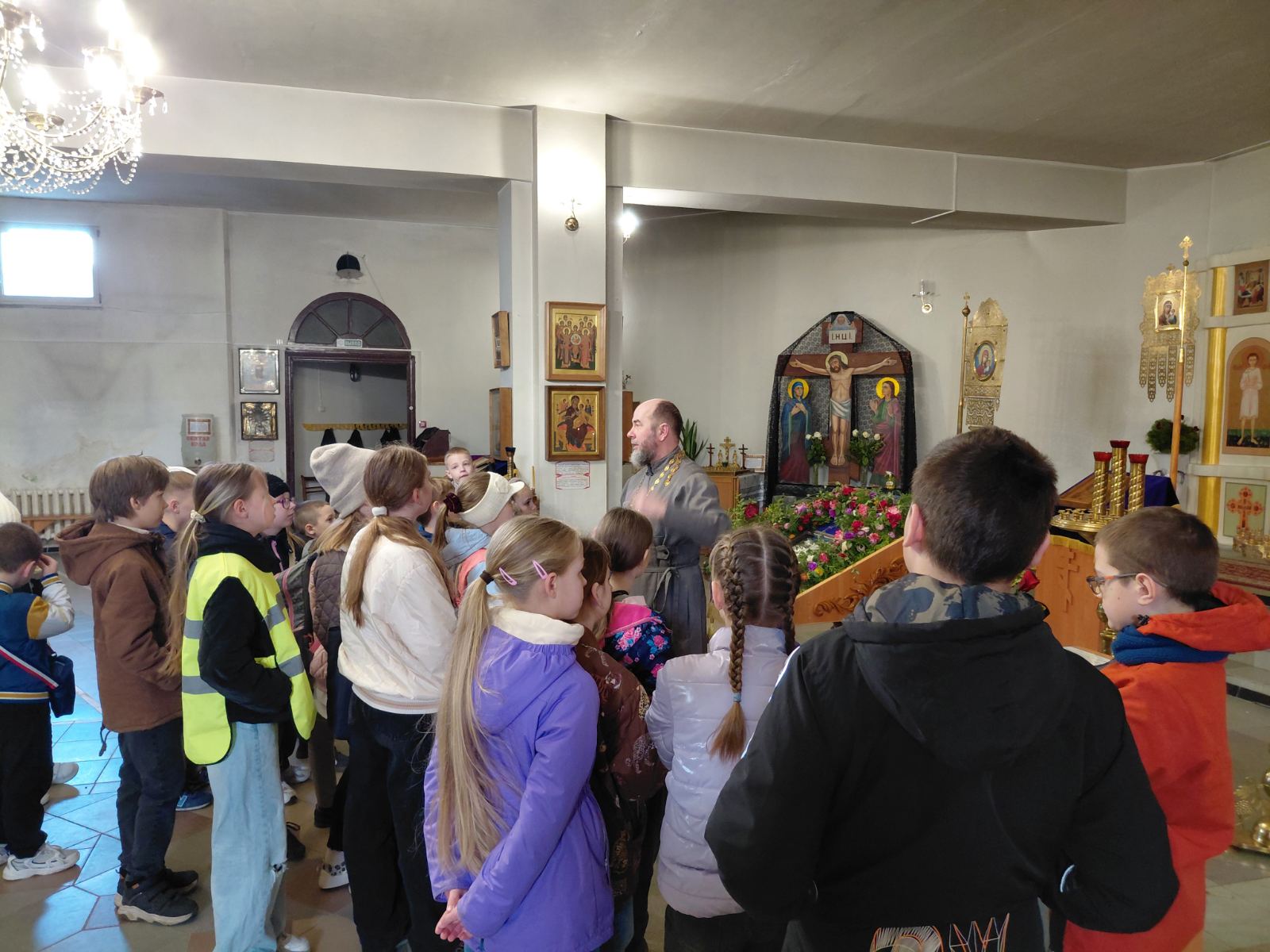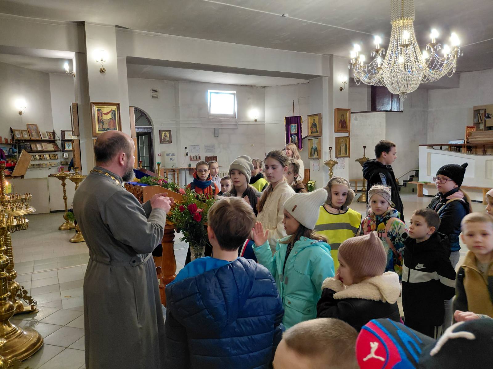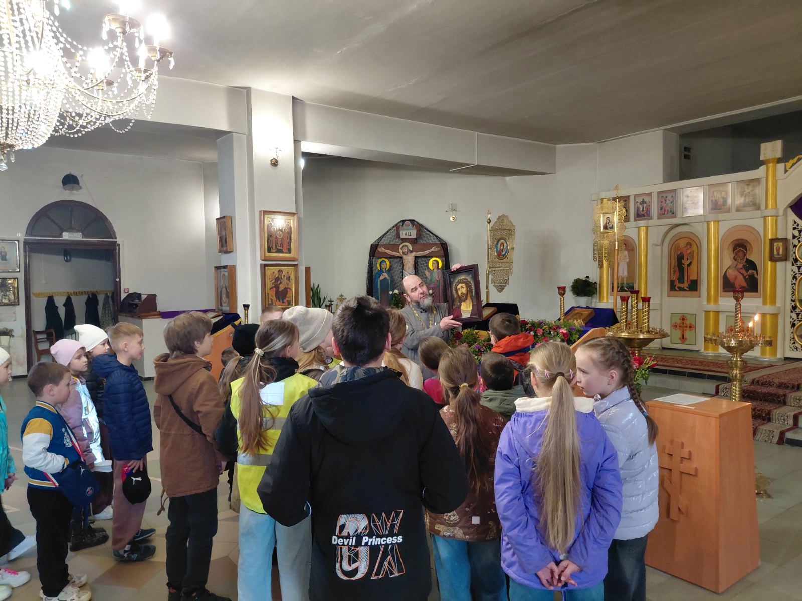 Экскурсию для детей провел настоятель храма протоиерей Димитрий Белоцкий. Священнослужитель рассказал воспитанникам об устройстве храма, познакомил со святынями и ответил на вопросы учащихся.
