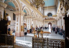 В канун понедельника Страстной седмицы архиепископ Антоний молился за уставным богослужением в кафедральном соборе Покрова Пресвятой Богородицы