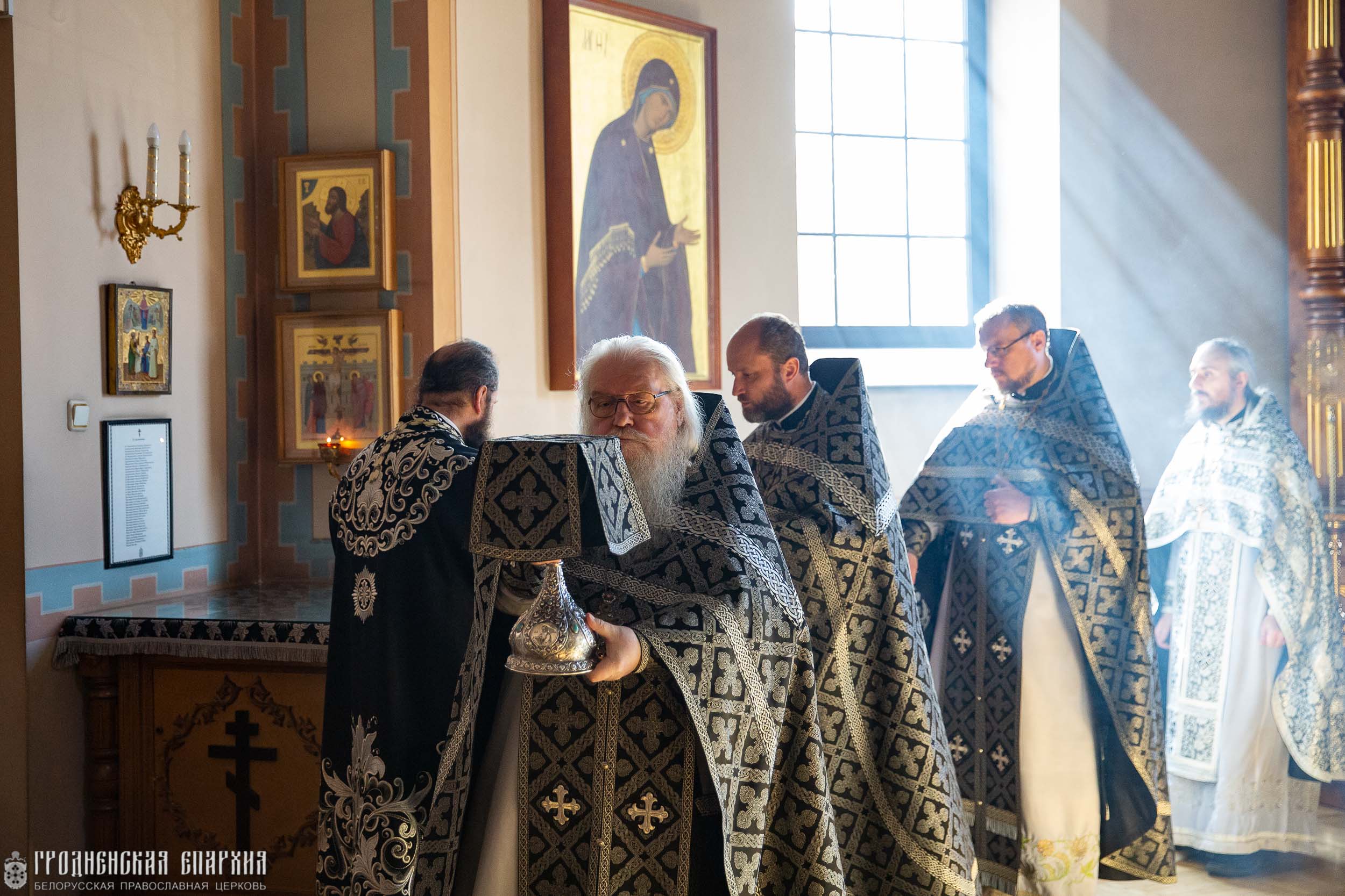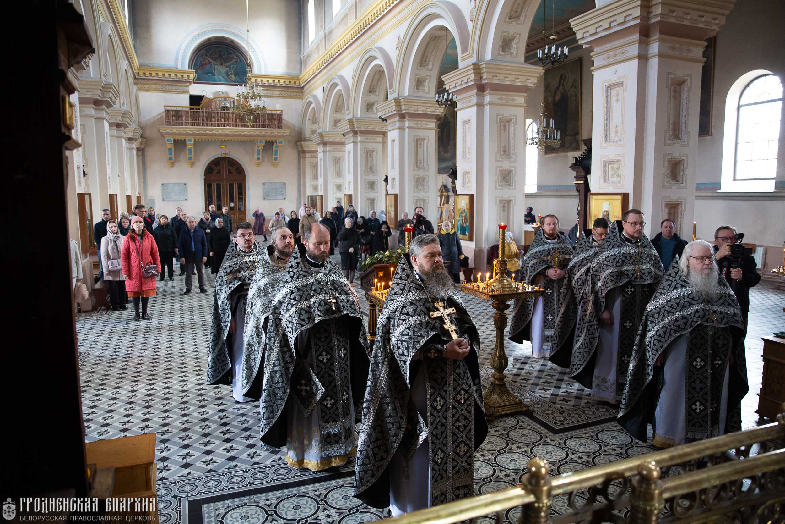 Архипастырю сослужили: протоиерей Григорий Беляцкий, настоятель кафедрального собора Покрова Пресвятой Богородицы; протоиерей Андрей Бондаренко, духовник Гродненской епархии; иерей Александр Гук, руководитель отдела по церковной благотворительности и социальному служению Гродненской епархии; иеромонах Николай (Есоян), настоятель прихода храма Преображения Господня г. п. Сопоцкин Гродненского района; клирики кафедрального собора.