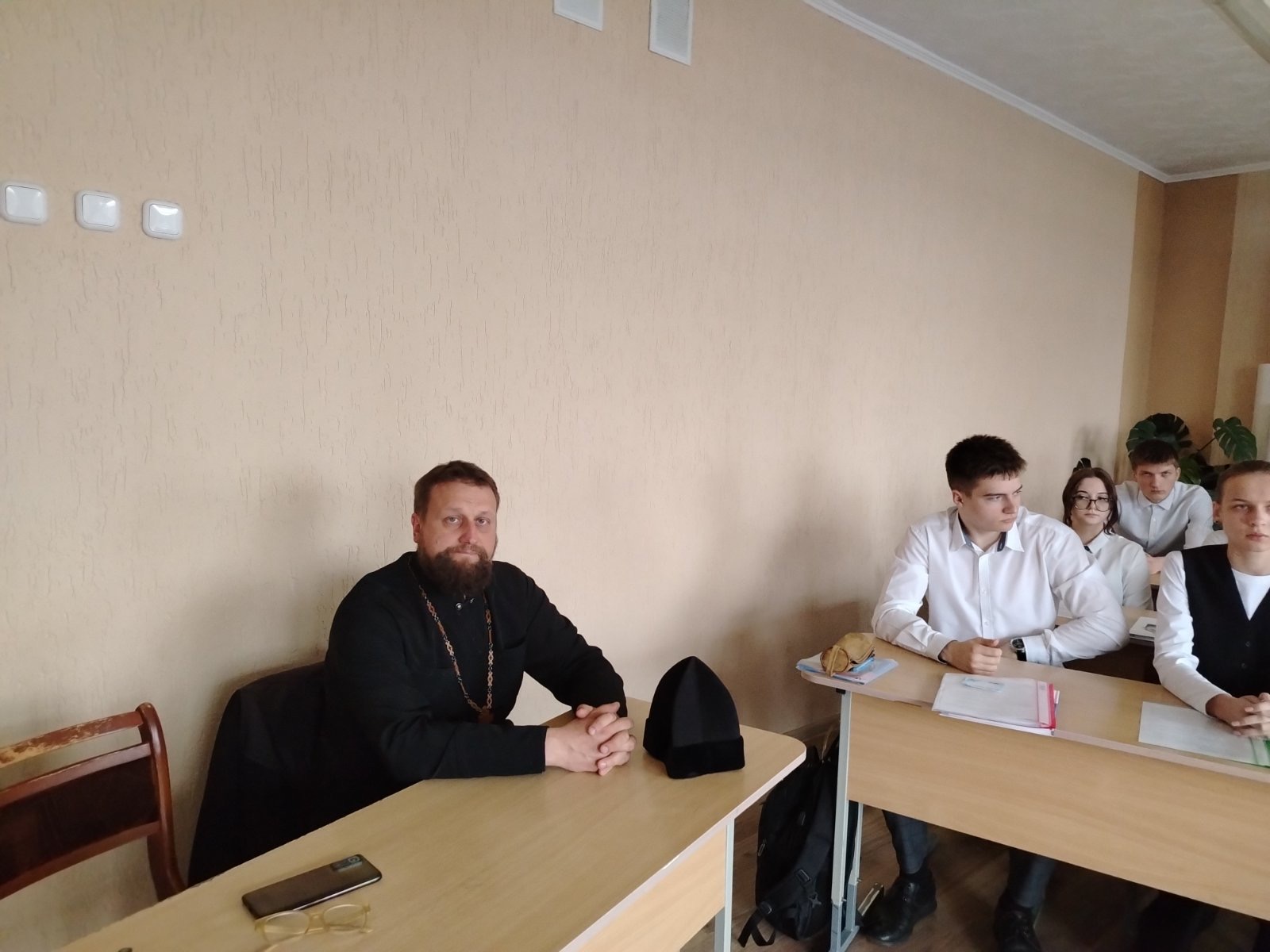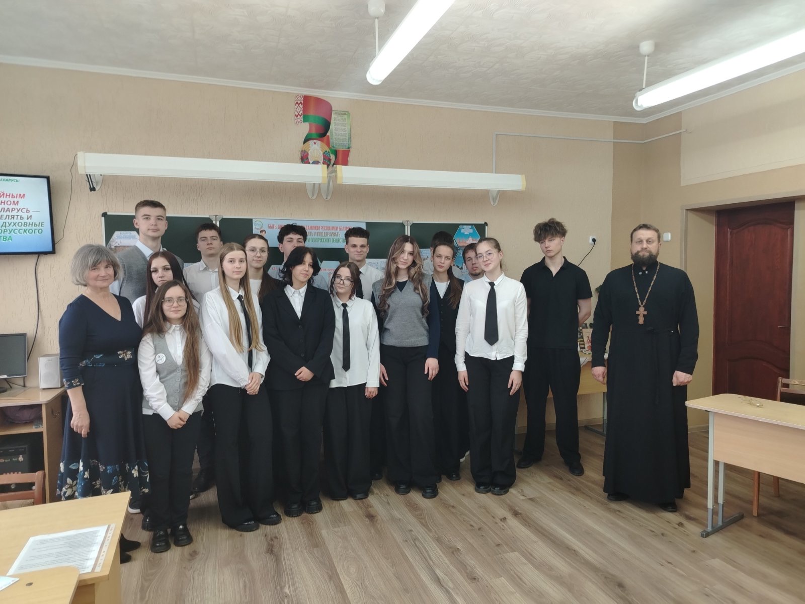 На встрече присутствовал настоятель храма святой праведной Софии, княгини Слуцкой г. Мосты иерей Иоанн Авсиевич. Священник обратился к школьникам с пастырским словом о том, что истинное гражданство неразрывно связано с внутренним духовным стержнем человека, с его способностью различать добро и зло, следовать голосу совести и бережно относиться к традициям предков. Отец Иоанн подчеркнул, что такие ценности, как любовь к ближнему, милосердие, честность и ответственность, являются основой крепкой семьи и сильного общества.