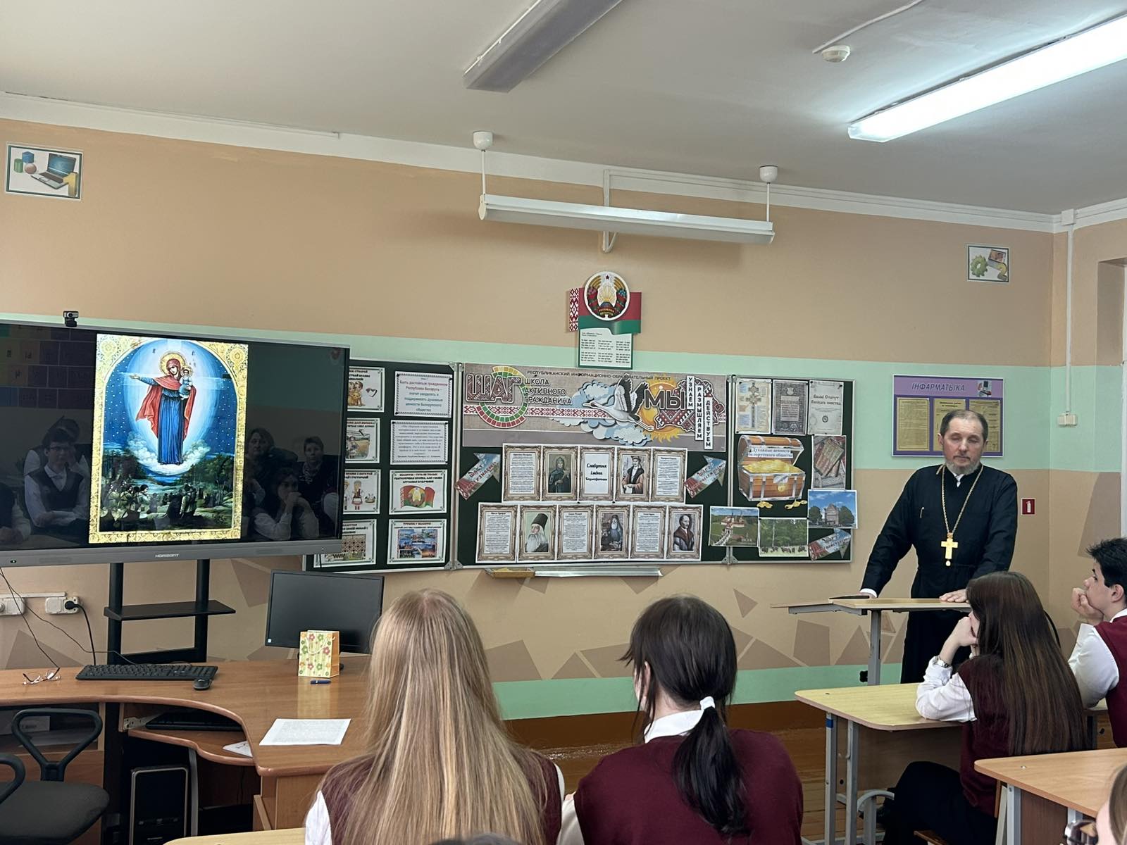 Священник предложил школьникам поразмышлять над вопросами о том, что представляют собой духовные ценности белорусского общества и почему их необходимо знать, понимать, бережно сохранять и преумножать. В качестве наглядного примера вместе со священнослужителем учащиеся подробно рассмотрели историю Коложской и Августовской икон Пресвятой Богородицы, узнали о жизни и подвиге по защите веры и Отечества Давида Городенского.