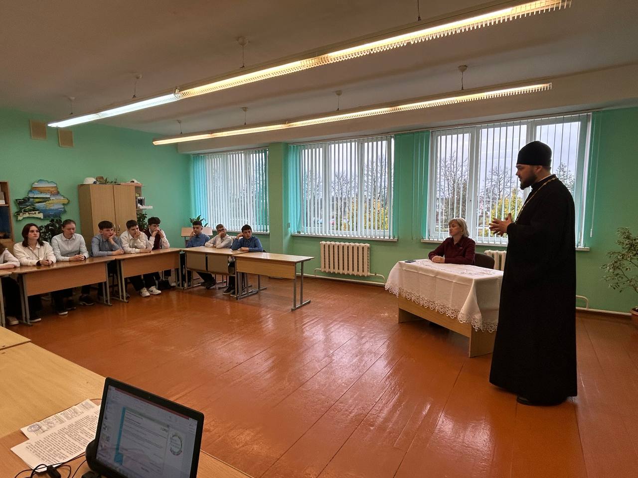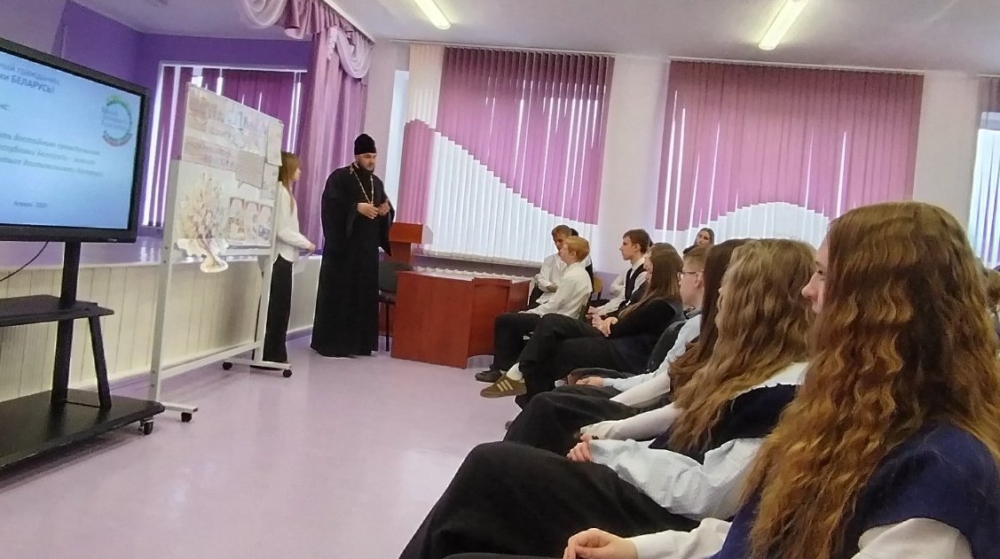 В ходе урока основное внимание было уделено историко-культурному наследию Беларуси. Отец Евгений подробно рассказал о роли духовных и семейных ценностей, акцентировал внимание учащихся на важности уважительного и доброго отношения друг к другу как внутри семьи, так и в обществе в целом.