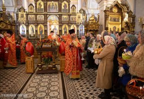 После заамвонной молитвы правящий архиерей совершил чин освящения артоса, вознес молитву на благословение пасхальной снеди, освятил пасхальные приношения и обратился к верующим с архипастырским словом.