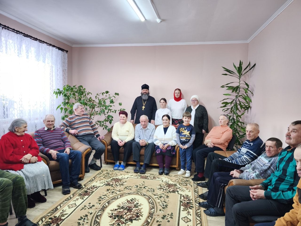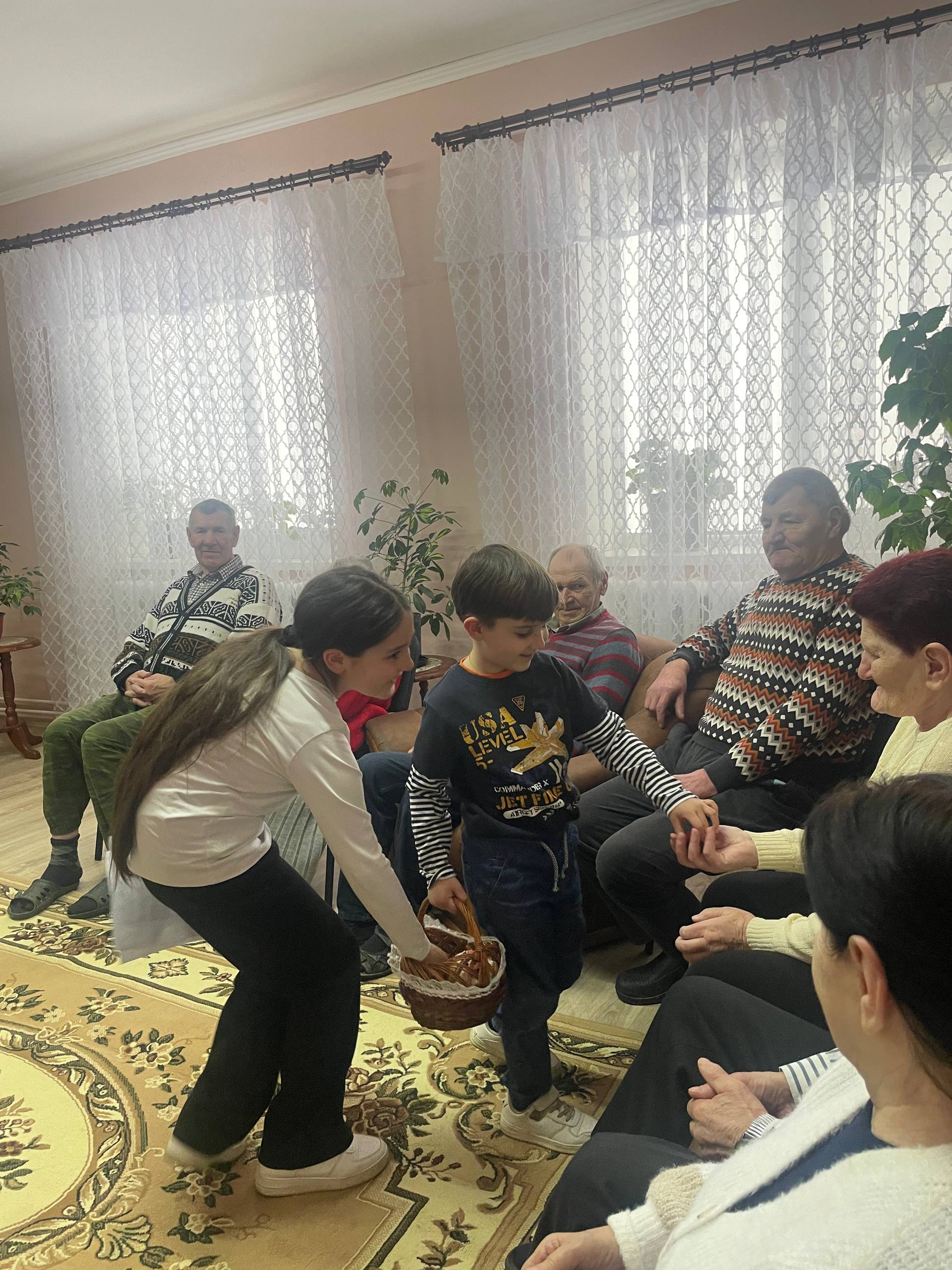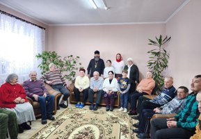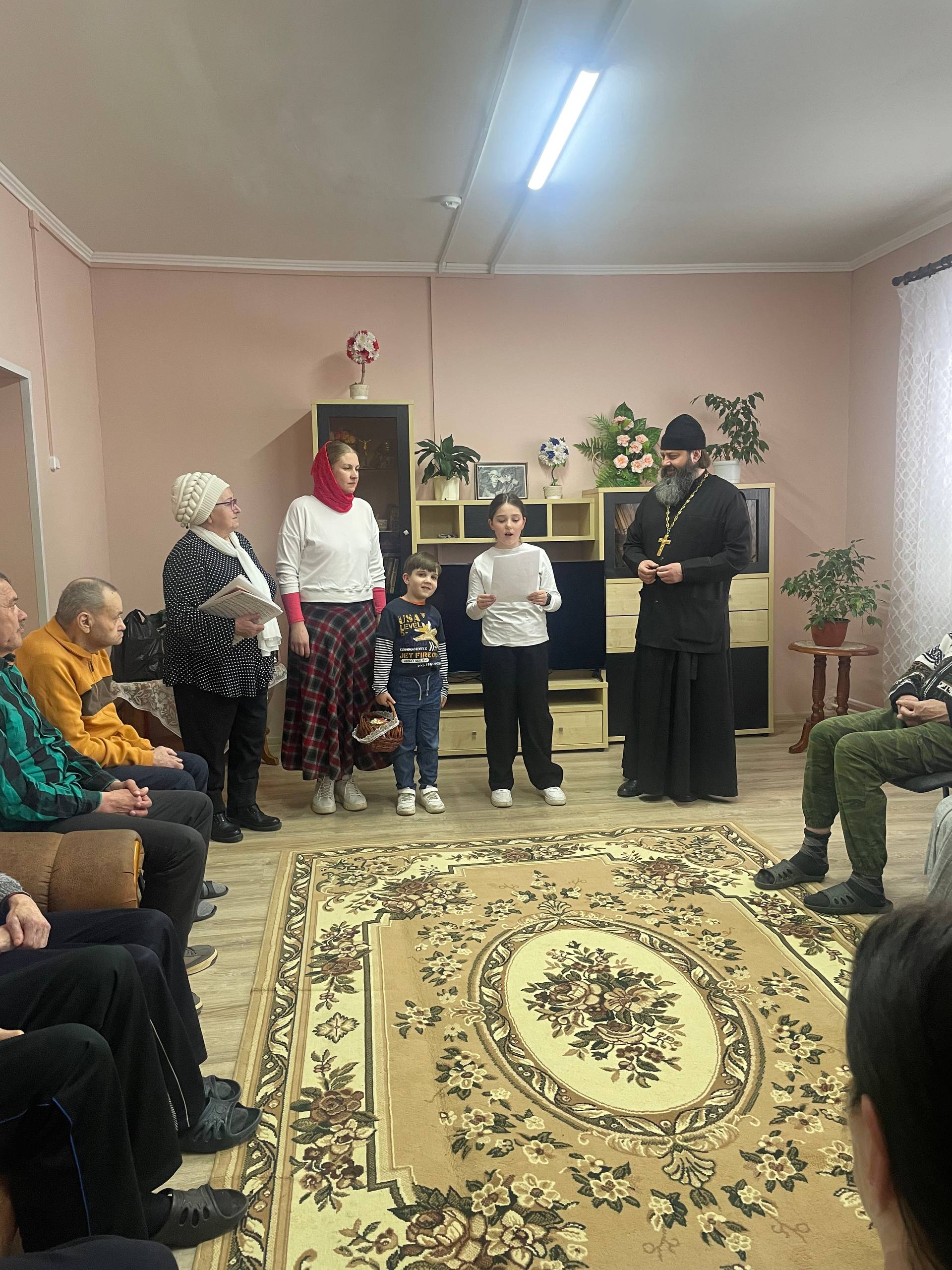 Юные гости исполнили пасхальные песнопения, прославляя Воскресшего Христа. Иерей Игорь тепло поздравил проживающих и сотрудников с праздником, пожелав им здоровья, мира и пасхальной радости. Сотрудникам учреждения были переданы сладкие подарки для насельников.