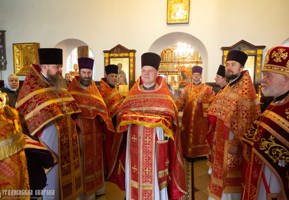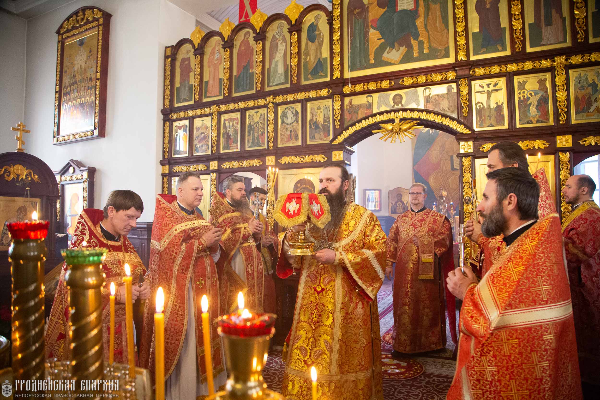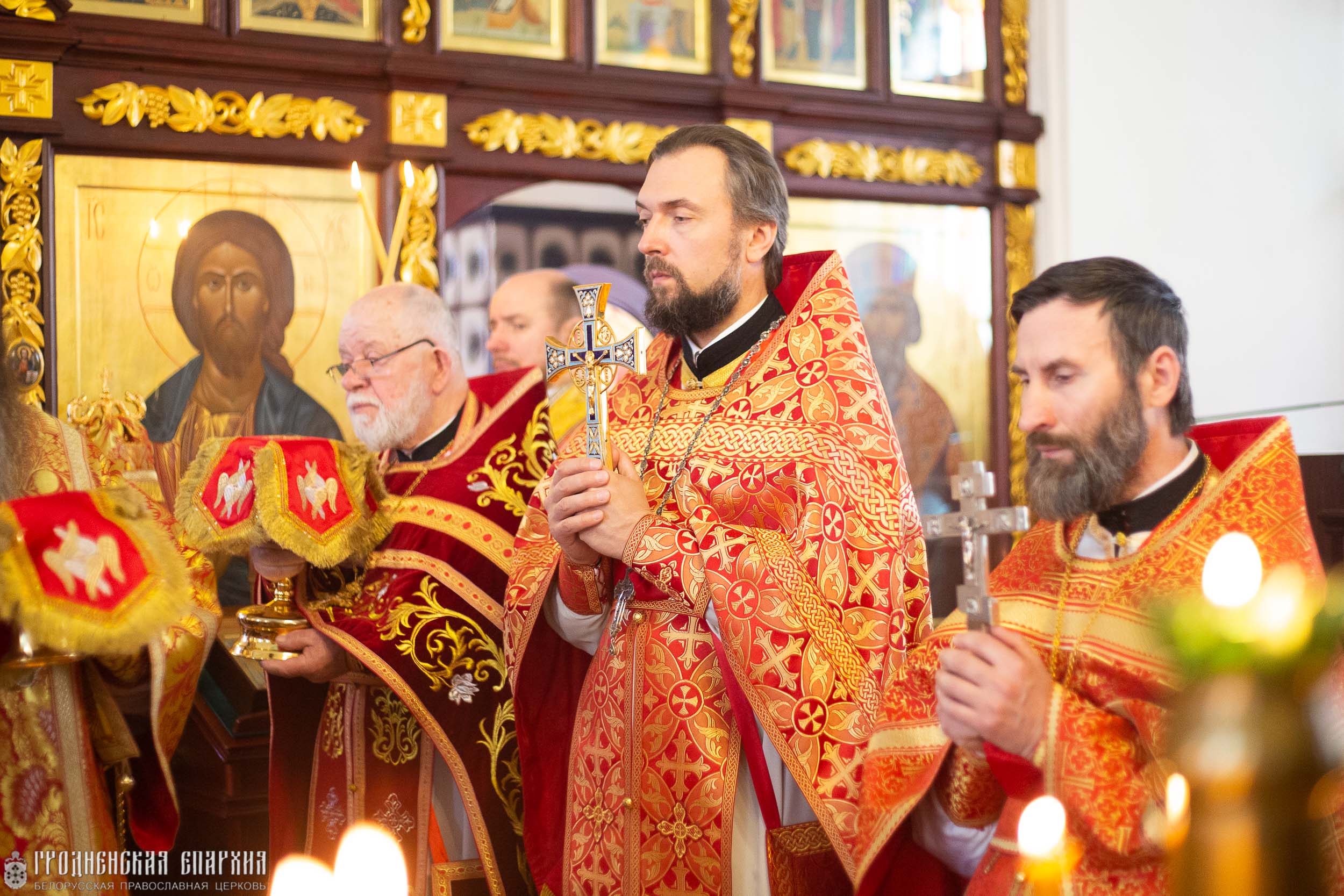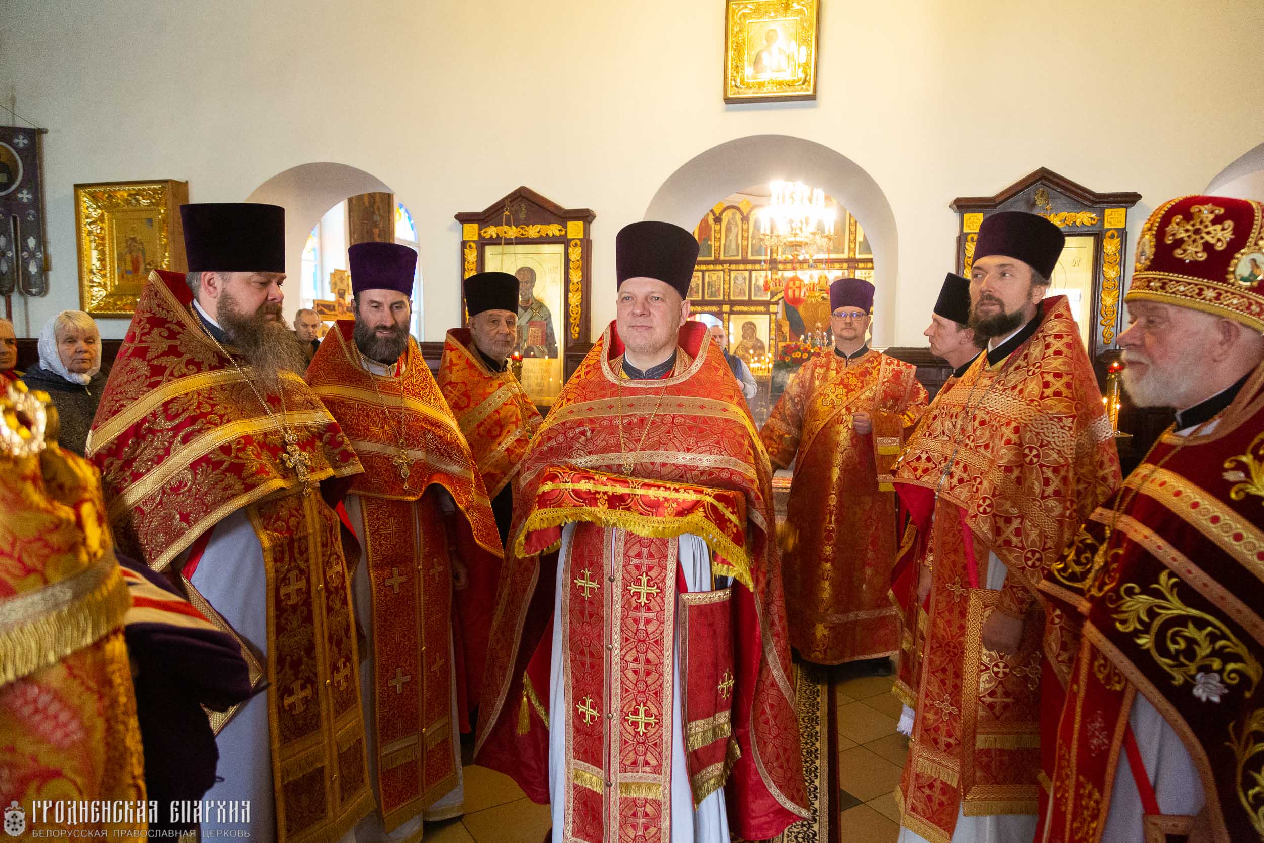 Его Высокопреосвященству сослужили: протоиерей Григорий Беляцкий, настоятель кафедрального собора Покрова Пресвятой Богородицы г. Гродно; протоиерей Вячеслав Гапличник, благочинный Гродненского городского церковного округа; протоиерей Михаил Велисейчик, клирик прихода храма преподобномученика Серафима Жировичского г. Гродно; протоиерей Александр Велисейчик настоятель прихода храма святого равноапостольного князя Владимира; протоиерей Александр Железный, настоятель прихода храма Усекновения главы Иоанна Предтечи г. Гродно; протоиерей Иоанн Велисейчик, настоятель прихода храма преподобномученика Серафима Жировичского г. Гродно.
