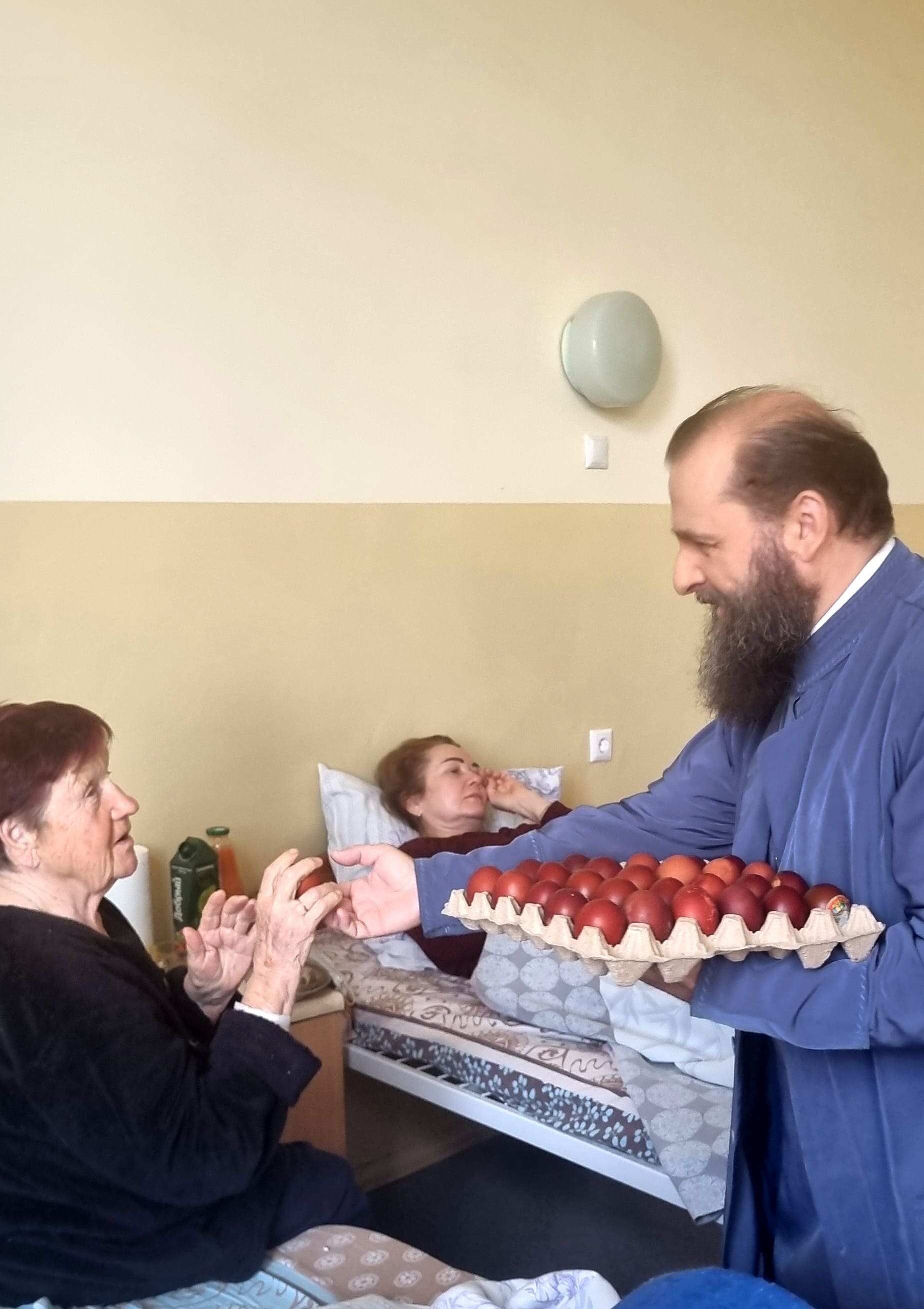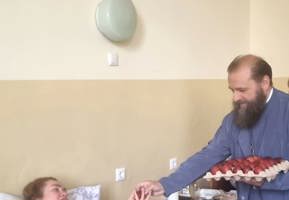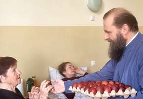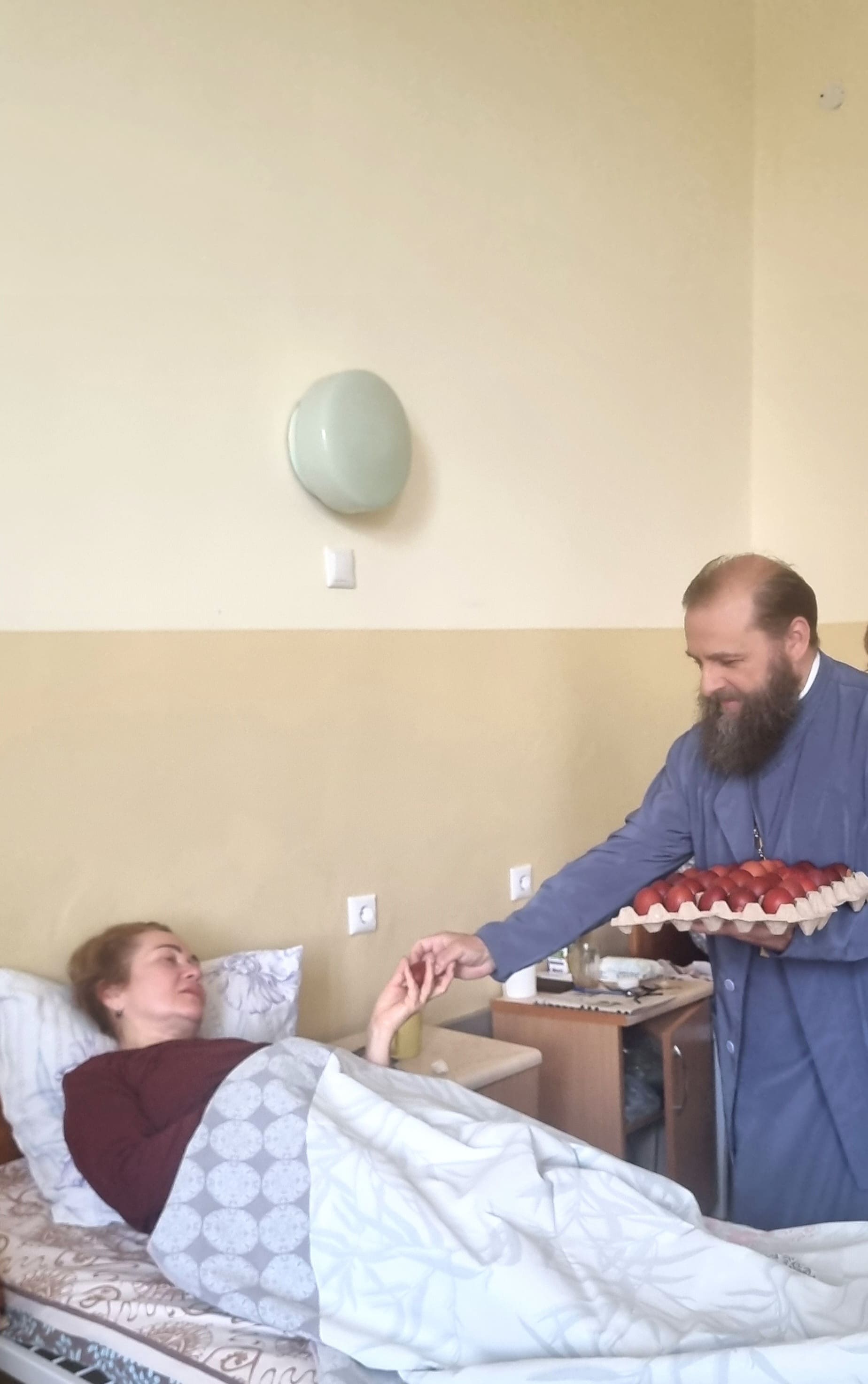 Затем, обходя отделения больницы, священник поздравил с Пасхой пациентов, которые вынужденно остаются в стенах учреждения здравоохранения в эти светлые дни. Каждый из них получил из рук протоиерея Владимира в дар освященное пасхальное яйцо — символ Воскресения Христова. Для многих страждущих такая встреча стала настоящим духовным утешением и напоминанием о том, что они не одни, что о них помнят и молятся.